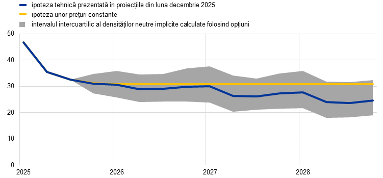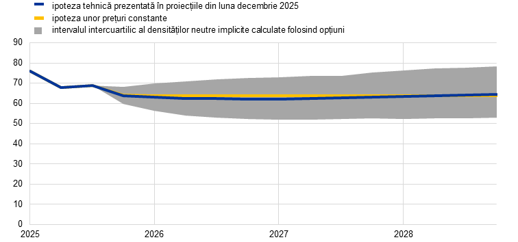 Notă: În cadrul acestei analize a senzitivității, se utilizează un indice sintetic al prețurilor produselor energetice, care combină cotațiile futures ale petrolului și ale gazelor naturale. Cea de-a 25-a percentilă și cea de-a 75-a percentilă se referă la densitățile neutre implicite calculate folosind opțiuni pentru prețurile petrolului și ale gazelor naturale la 26 noiembrie 2025. Prețurile constante ale petrolului și ale gazelor naturale iau în considerare valoarea aferentă la aceeași dată. Efectele macroeconomice sunt prezentate ca medii ale unei serii de modele macroeconomice elaborate de experții BCE și ai Eurosistemului.