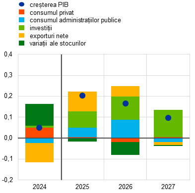 Notă: Cifrele aferente PIB real se referă la medii anuale ale datelor ajustate sezonier și cu numărul zilelor lucrătoare. Datele istorice pot fi diferite de cele mai recente date publicate de Eurostat, având în vedere publicarea acestora după data-limită pentru proiecții. Revizuirile sunt calculate pe baza valorilor rotunjite. Datele pot fi descărcate, tot cu frecvență trimestrială, din baza de date conținând proiecții macroeconomice de pe website-ul BCE.