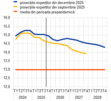 Economia zonei euro se dovedește a fi rezilientă, în pofida contextului internațional dificil. PIB real a consemnat un avans de 0,3% în trimestrul III 2025, nivel superior celui estimat în proiecțiile din luna septembrie, ca urmare a evoluțiilor volatile din prima jumătate a anului, reflectând efectele devansării activității economice pe fondul tarifelor comerciale mai ridicate impuse de SUA și al incertitudinilor asociate, precum și impactul fluctuațiilor puternice ale datelor referitoare la Irlanda. Cererea internă ar trebui să rămână principalul motor al creșterii economice în zona euro, susținută de majorarea salariilor reale și a gradului de ocupare a forței de muncă, în contextul unor piețe reziliente ale forței de muncă, cu niveluri minime istorice ale ratei șomajului. Potrivit anticipațiilor, cheltuielile bugetare suplimentare pentru infrastructură și apărare anunțate în acest an, mai ales în Germania, alături de ameliorarea condițiilor de finanțare, determinată de reducerile ratelor dobânzilor de politică monetară începând cu luna iunie 2024, ar trebui să susțină, de asemenea, economia internă. Pe plan extern, deși persistă dificultăți de competitivitate, inclusiv de natură structurală, se estimează o accelerare a exporturilor în anul viitor. Această îmbunătățire este atribuită revigorării cererii externe pe fondul diminuării incertitudinilor asociate politicilor comerciale, în pofida manifestării progresive a impactului exercitat de majorarea tarifelor vamale. Se anticipează că ritmul mediu anual de creștere a PIB real va fi de 1,4% în 2025, de 1,2% în 2026, de 1,4% în 2027 și de 1,4% în 2028. Comparativ cu proiecțiile din luna septembrie 2025, creșterea PIB a fost revizuită în sens ascendent pe parcursul întregului orizont de proiecție, reflectând datele peste așteptări, reducerea incertitudinilor asociate politicilor comerciale, consolidarea cererii externe și scăderea prețurilor materiilor prime energetice.[1]