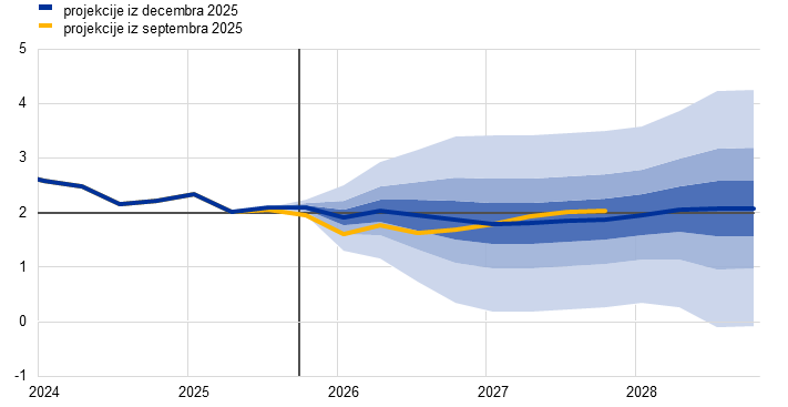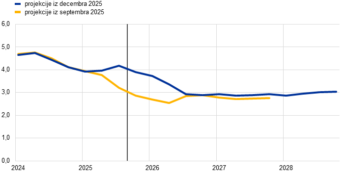 Po projekcijah se bo inflacija znižala z 2,1% v letu 2025 na 1,9% v letu 2026 in nato na 1,8% v letu 2027, zatem pa se bo leta 2028 zvišala na 2%, kar je srednjeročni cilj ECB. Pričakovano znižanje skupne inflacije (merjene s harmoniziranim indeksom cen življenjskih potrebščin, HICP) v začetku leta 2026 je posledica navzdol delujočih baznih učinkov, ki izhajajo iz cen energentov, medtem ko naj bi se inflacija v drugih skupinah razen energentov tekom leta 2026 še naprej zniževala. Prispevek inflacije v skupini energentov k skupni inflaciji bo do konca leta 2027 predvidoma ostal umirjen, nato pa naj bi se leta 2028 izrazito povečal zaradi pričakovane uvedbe 2. generacije sistema EU za trgovanje z emisijami (ETS2), kar naj bi skupno inflacijo potisnilo navzgor za 0,2 odstotne točke. Inflacija brez energentov se bo po pričakovanjih znižala z 2,5% v letu 2025 na 2,2% v letu 2026 ter na 2,0% v letih 2027 in 2028. Inflacija v skupini hrane se bo po projekcijah opazno znižala, saj bodo učinki predhodne rasti cen svetovnih prehrambnih surovin in neugodnih vremenskih razmer v poletnih mesecih popustili, proti koncu leta 2026 pa naj bi se ustalila na ravni nekoliko nad 2%. Inflacija brez energentov in hrane se bo po projekcijah umirila z 2,4% v letu 2025 na 2,0% v letu 2028, ko se bo storitvena inflacija znižala zaradi vse manjših pritiskov s strani stroškov dela in ko se bo pretekla apreciacija eura prelila vzdolž cenovne verige, kar bo zaviralo blagovno inflacijo. Rast plač naj bi se med letom 2026 še naprej umirjala, nato pa naj bi se stabilizirala na ravni okrog 3% ob podpori odpornega trga dela in rasti produktivnosti tik pod 1%. Rast stroškov dela na enoto proizvoda se bo predvidoma umirila, vseeno pa naj bi vpliv na inflacijo deloma odtehtalo postopno okrevanje profitnih marž v obdobju projekcij. V primerjavi s septembrskimi projekcijami so bili obeti glede skupne inflacije za leto 2026 popravljeni navzgor za 0,2 odstotne točke zaradi nedavnih presenečenj v podatkih o inflaciji in rasti plač, pri čemer je slednje privedlo do opaznega popravka plačnih obetov navzgor. Projekcija inflacije za leto 2027 je bila rahlo popravljena navzdol zaradi predpostavljenega manjšega prispevka inflacije v skupini energentov, saj se zdaj pričakuje, da bo uvedba sistema ETS2 preložena z leta 2027 na leto 2028, čeprav naj bi bil ta prispevek delno izravnan z višjo storitveno inflacijo.
