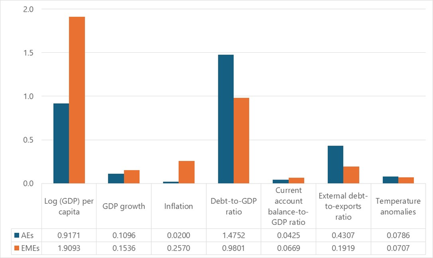 Notes: The figure shows the absolute value of the effect of a (1% Winsorised) one standard deviation shock of macroeconomic and climate risk variables on sovereign credit ratings for advanced economies (AEs) and emerging market economies (EMEs). The impact elasticities are derived from a panel regression covering 124 countries over the period 1999-2021. The dependent variable is the average of the sovereign ratings issued by S&P Global Ratings, Moody’s, FitchRatings and Morningstar DBRS.