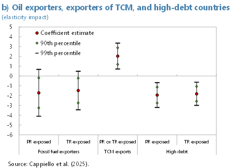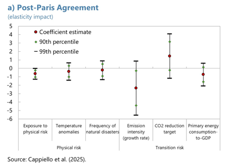 Notes: Panel a) shows coefficient estimates from six difference-in-difference models for physical risk (PR) and transition risk (TR). “Exposure to physical risk” is interacted with a post-Paris Agreement (PPA) dummy variable, set to one after 2015. “Temperature anomalies” and “Frequency of natural disasters” are interacted with the PR and PPA dummy variables. “Emission intensity” is interacted with the TR and PPA dummy variables. The “CO2 reduction target” interacts with the TR dummy variable, while the “Primary energy consumption-to-GDP ratio” interacts with the TR and PPA dummy variables. Panel b) shows coefficient estimates from five difference-in-difference models, augmented with information on fossil fuel reliance, transition-critical material (TCM) exports, and indebtedness levels. The first two coefficients represent triple interactions among climate risk exposure dummy variables (PR and TR), the PPA dummy variable, and fossil fuel reliance, defined as a time-invariant dummy variable equal to one if the country is among the top 20 fossil fuel exporters. The third coefficient represents the triple interaction among an exposure dummy variable (to PR or TR), the PPA dummy variable, and TCM exports as a percentage of the country’s total exports. The fourth and fifth coefficients represent double interactions between the PPA dummy variable and a high-debt dummy variable, set to one if the country’s debt-to-GDP ratio in 2015 exceeds the median for advanced economies and emerging market economies prior to 2015. The sample period for all estimates is from 1999 to 2021.