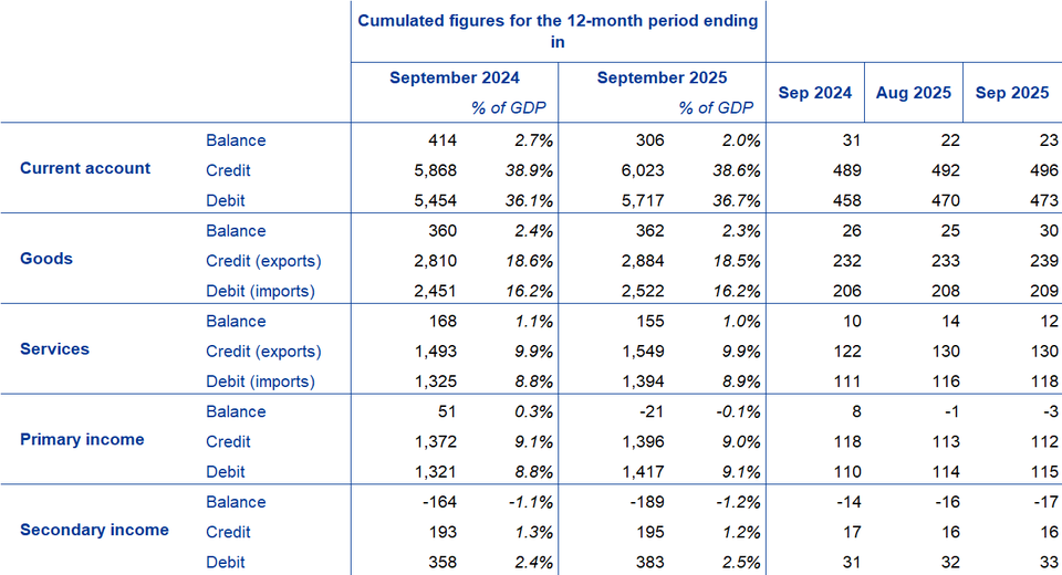 In the 12 months to September 2025, the current account recorded a surplus of €306 billion (2.0% of euro area GDP), compared with a surplus of €414 billion (2.7% of euro area GDP) one year earlier. This decrease was mainly driven by a switch from a surplus (€51 billion) to a deficit (€21 billion) for primary income, but also by a larger deficit for secondary income (up from €164 billion to €189 billion) and a reduction in the surplus for services (down from €168 billion to €155 billion). These developments were partly offset by a slightly larger surplus for goods (up from €360 billion to €362 billion).