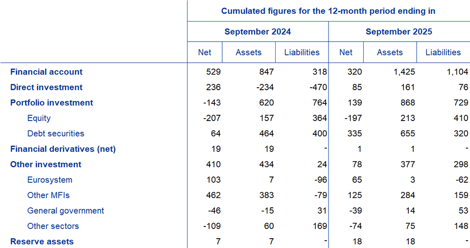 - Current account surplus amounted to €306 billion (2.0% of euro area GDP) in the 12 months to September 2025, down from €414 billion (2.7%) one year earlier