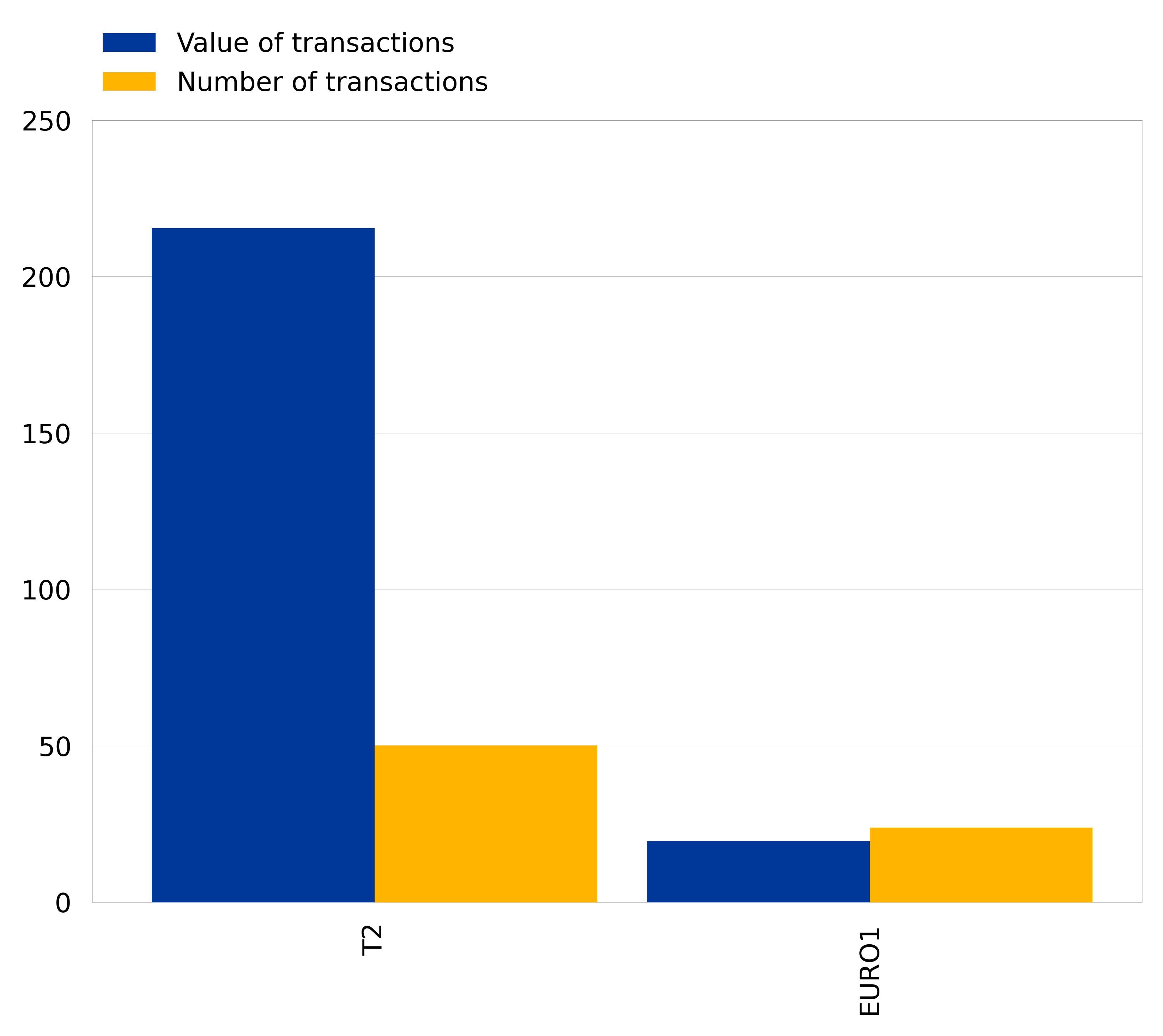 In the first half of 2025, large-value payment systems located in the euro area settled 74.0 million payments with a total value of €235.1 trillion in euro payments, with T2 and EURO1 being the two main systems.[14]