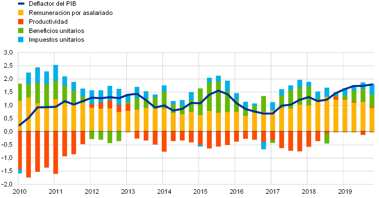 - Véase el recuadro titulado «La influencia de los beneficios en las presiones inflacionistas internas en la zona del euro», Boletín Económico, número 6, BCE, 2019.
