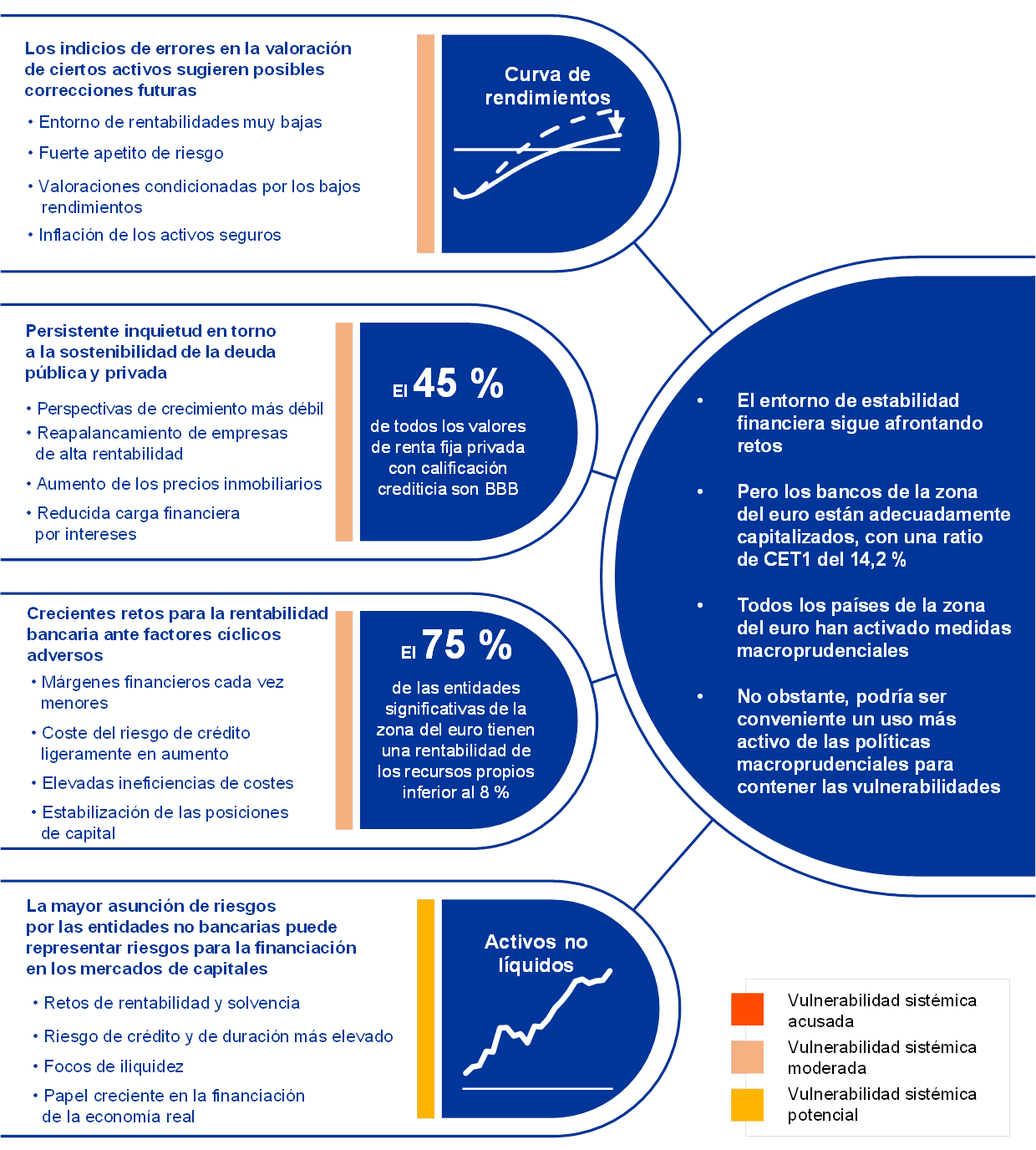 La rentabilidad estructuralmente baja sigue siendo un problema para las entidades de crédito de la zona del euro, si bien el sector está adecuadamente capitalizado, con una ratio de capital de nivel 1 ordinario (CET1) del 14,2 %. En 2019, la elevada asunción de riesgos en los mercados financieros e inmobiliarios continuó incrementando las vulnerabilidades de los precios de los activos, al tiempo que siguieron acumulándose riesgos en el cada vez mayor sector financiero no bancario. Los países de la zona del euro, previa consulta con el BCE, implementaron una serie de medidas macroprudenciales para mitigar y reforzar la capacidad de resistencia frente a los riesgos sistémicos.