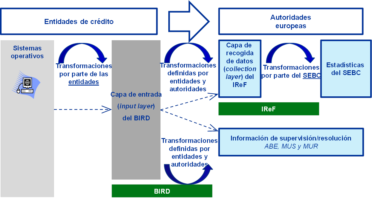 - Aquí nos referimos, principalmente, a los conjuntos de datos relacionados con las obligaciones de información de las entidades de depósito que se establecen en: los reglamentos del BCE sobre estadísticas de las partidas del balance y de los tipos de interés de las instituciones financieras monetarias, el módulo sectorial del Reglamento relativo a las estadísticas sobre carteras de valores, y el Reglamento de AnaCredit sobre datos granulares de crédito y de riesgo de crédito.