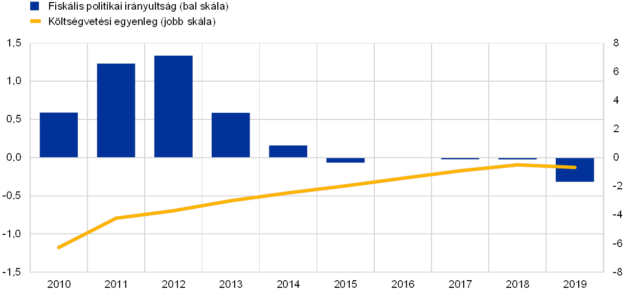 - A fiskális politikai irányultság a fiskális politika gazdaságösztönzésének irányát és méretét tükrözi, az államháztartás konjunktúraciklusra való automatikus reakcióján túl. A pénzügyi szektornak nyújtott állami támogatást nem tartalmazó ciklikusan kiigazított elsődleges egyenleg arány változásával mérjük. Az euroövezet fiskális politikai irányultsága koncepciójára vonatkozó további információkért lásd a „The euro area fiscal stance” (Az euroövezet fiskális politikai irányultsága) című cikket, Economic Bulletin, 4. sz., EKB, 2016.