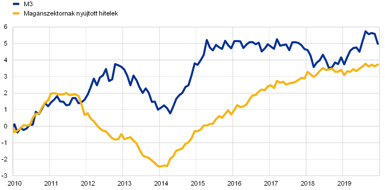 A 2018. közepi csúcsot követően, a kereskedelemmel kapcsolatos bizonytalanság meredek növekedése közepette 2019-ben jelentősen lassult a világgazdaság. A kiterjedt lassulás egyidejűleg következett be az egyes országokban. Ezzel összefüggésben az euroövezet gazdasági növekedése az előző évi 1,9%-ról tovább mérséklődött, 1,2%-ra. A növekedés 2019-ben bekövetkezett mérséklődésének fő oka a gyengébb nemzetközi kereskedelem volt egy elhúzódó globális bizonytalansággal jellemzett környezetben. Ugyanakkor a lassulást enyhítették a kedvező finanszírozási feltételek, a foglalkoztatás további bővülése és az emelkedő bérek, az euroövezet enyhén expanzív fiskális politikai irányultsága, valamint a globális konjunktúra folyamatos – bár lassúbb – növekedése. További javulás következett be az euroövezeti munkaerőpiacokon, miközben lényegesen lassult a termelékenység növekedése. Az inflációs nyomások általában mérsékeltek maradtak. A fogyasztóiár-index alapján mért infláció az energia és az élelmiszerek alacsonyabb inflációja következtében 1,2%-ra csökkent, miközben az alapinfláció visszafogott maradt. A kedvező finanszírozási feltételek továbbra is támogatták a hitel- és a pénzállomány növekedését Az euroövezeti államkötvényhozamok jelentősen csökkentek, miközben az euroövezeti részvényárfolyamok – elsősorban az alacsonyabb diszkontráták következtében – emelkedtek. A háztartások vagyonához hozzájárult az ingatlan javak és a pénzeszközök értéknövekedése.