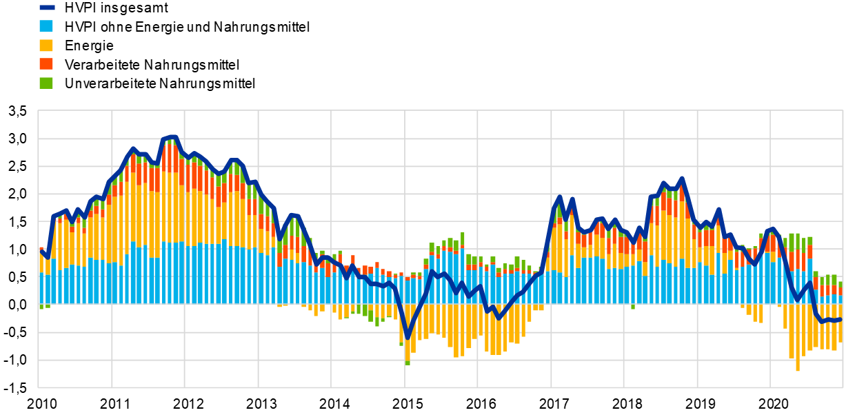 Mit dem Ölpreisverfall zu Beginn der Pandemie trug die Energiepreisentwicklung 2020 wesentlich zum gegenüber dem Vorjahr verzeichneten Rückgang der durchschnittlichen Gesamtinflation bei. Im Gegensatz dazu stieg der entsprechende Beitrag der Nahrungsmittelkomponente insgesamt gegenüber 2019 leicht an und erreichte im Berichtsjahr 0,4 Prozentpunkte. Dies war zum Großteil darauf zurückzuführen, dass sich in der Pandemie vor allem die Preissteigerung bei unverarbeiteten Nahrungsmitteln vorübergehend beträchtlich beschleunigte (und im April 2020 mit 7,6 % eine Spitze erreichte).[11]