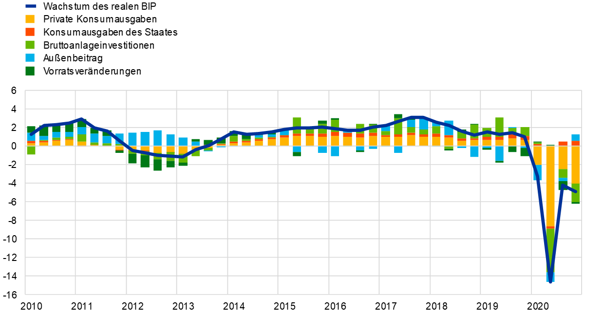 Die Wirtschaft des Euroraums hat 2020 durch die Covid-19-Pandemie einen außerordentlichen und schweren Schock erlitten. Lockdown-Maßnahmen und eine erhöhte Risikoaversion ließen die Wirtschaftstätigkeit in der ersten Jahreshälfte einbrechen. Im zweiten Halbjahr stabilisierte sich die Lage u. a. dank weitreichender, koordinierter geld- und fiskalpolitischer Maßnahmen sowie positiver Meldungen über Impfstoffe. Insgesamt schrumpfte das reale BIP des Euroraums im Berichtsjahr um 6,6 %. Die jährliche Gesamtinflation ging von 1,2 % im Jahr 2019 auf 0,3 % im Jahr 2020 zurück. Vor allem fallende Energiepreise, aber auch pandemiebedingte Faktoren waren der Grund für diese Entwicklung. So trugen z. B. die von der Krise am stärksten getroffenen Sektoren, wie etwa Transport und Gastgewerbe, dazu bei, dass sich die Inflation im zweiten Halbjahr abschwächte.