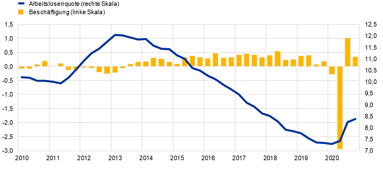 Die Beschäftigung fiel im Berichtsjahr um 1,9 %, und die Arbeitslosenquote erhöhte sich auf 8,4 %. Der Anstieg der Arbeitslosenquote fiel geringer aus als in früheren Rezessionen, z. B. jenen der Jahre 2008-2009 und 2011-2012. Zurückzuführen war dies auch auf die zeitnahe und umfassende Reaktion der Regierungen im Euroraum. Zugleich lag das Wachstum der Arbeitsproduktivität je Arbeitsstunde 2020 im Schnitt bei rund 1 % und wurde durch die beträchtliche Reduzierung der Anzahl der geleisteten Arbeitsstunden im Rahmen der Programme zur Arbeitsplatzsicherung gestützt.