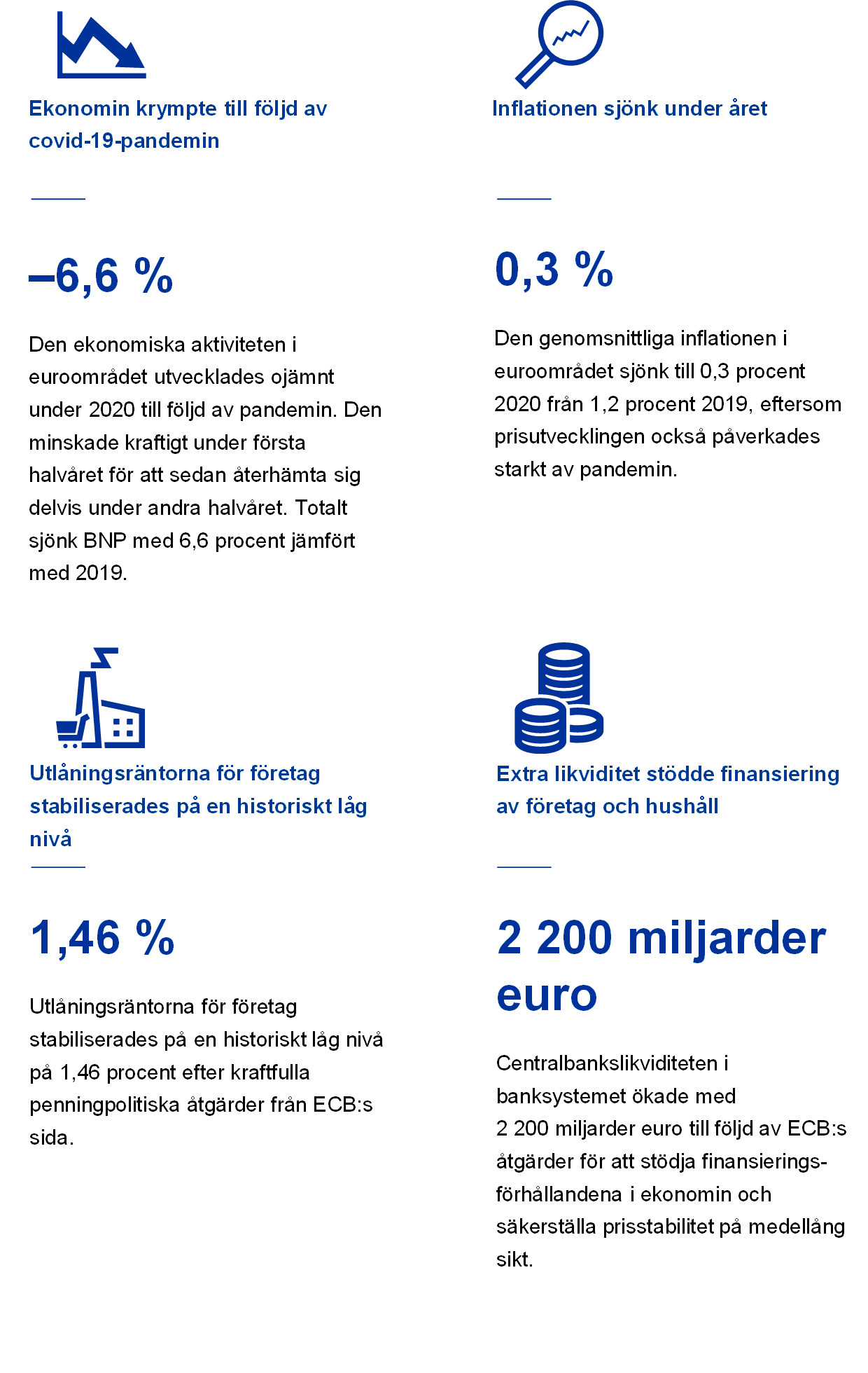 Ekonomin i euroområdet drabbades under 2020 av en extraordinär och allvarlig chock från coronaviruspandemin (covid-19). Den ekonomiska aktiviteten minskade kraftigt under det första halvåret till följd av nedstängningsåtgärder och ökad riskaversion. Den kraftfulla och koordinerade penning- och finanspolitiska responsen, i kombination med positiva nyheter om vaccin, bidrog till att stabilisera aktiviteten under det andra halvåret. Totalt sett sjönk BNP i euroområdet med 6,6 procent under 2020. Den årliga totala inflationen sjönk till 0,3 procent från 1,2 procent 2019, främst som resultat av sjunkande energipriser men även på grund av vissa faktorer relaterade till pandemin. Till exempel bidrog de sektorer som drabbades hårdast av pandemin, t.ex. rese- och hotellbranschen, till att inflationen sjönk under det andra halv året.
