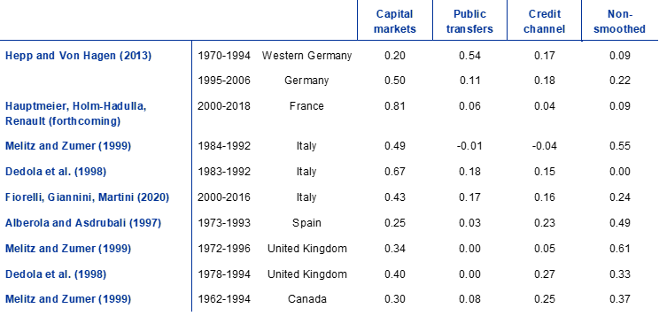 Note: The table shows the share of country-specific output shocks that were smoothed out through the capital, credit and fiscal channels in the United States, EU countries and other countries, together with the share of unsmoothed shocks, as estimated in the papers selected. The sum of the four columns is by construction equal to one. Full references for the papers shown are available in the paper cited in footnote 2.