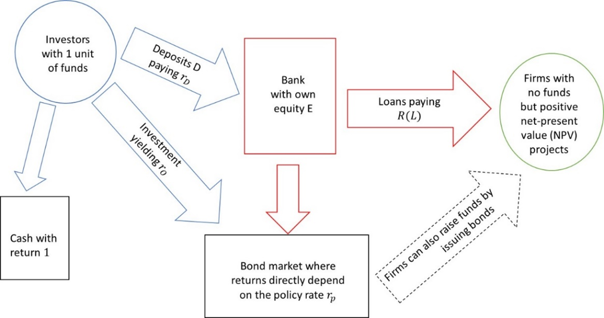 Our analysis is based on a partial-equilibrium model. Banks attract deposits from outside investors and provide loans to firms (Figure 2). As an alternative to issuing loans, banks can invest in bonds. Similarly, investors can either invest in bonds or hold cash instead of depositing it with a bank. Allowing investors to hold cash also introduces a hard ZLB on retail deposit rates. The substitutability between loans, deposits and bonds is the channel through which the policy rate affects loan and deposit rates.