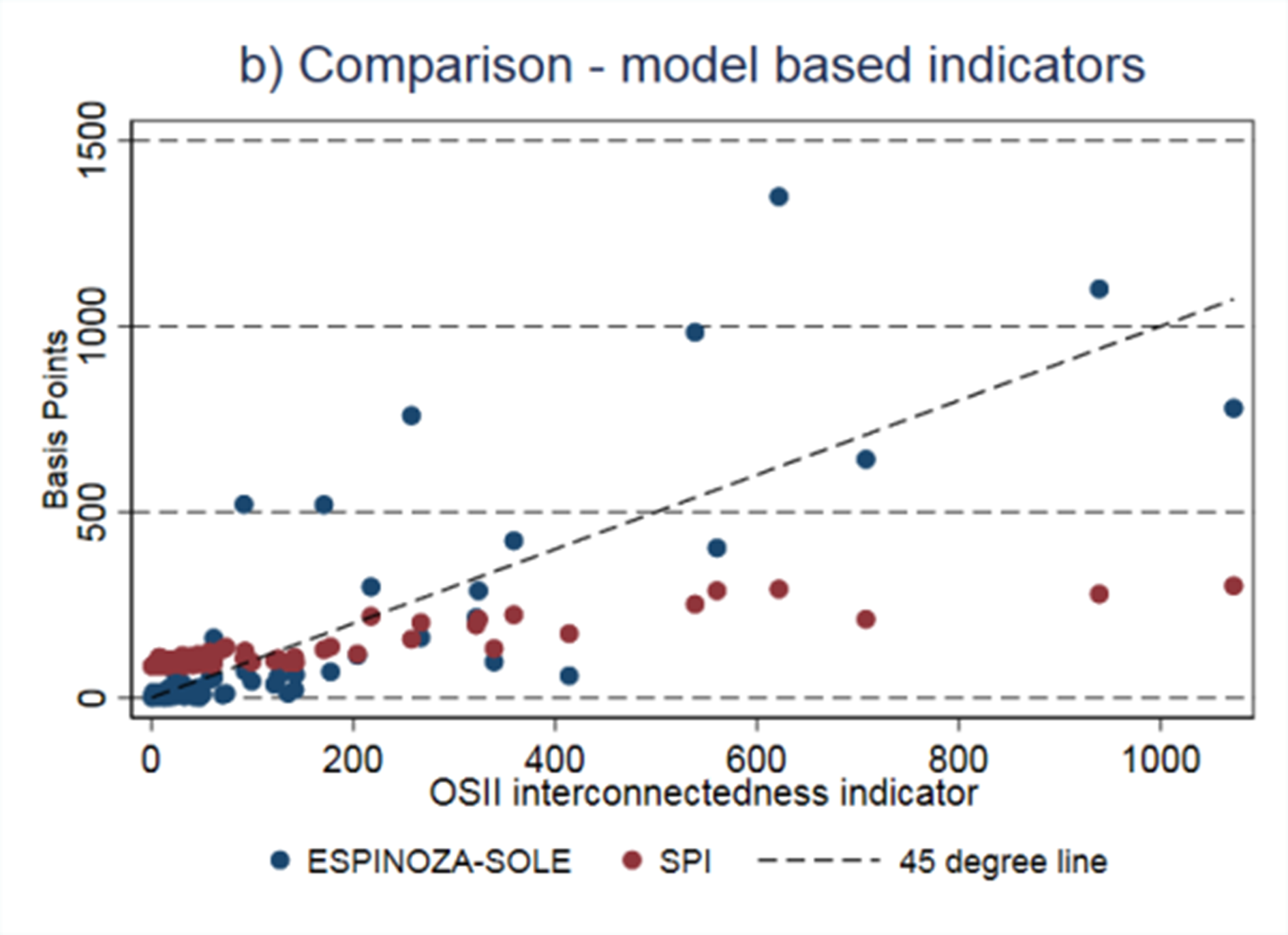 When comparing the interconnectedness indicator with the standard network measures for individual banks (see Figure 4, right-hand panel), the SPI follows a pattern similar to the standard network measures, while the ESI does not. The SPI assigns lower scores than the OII to institutions that are highly and medium connected (institutions with an OII above 150 basis points), and higher scores to less connected banks. The difference between the scores assigned to individual banks by the OII and the ESI is less pronounced and less systematic. Still, it can be deduced from the figure that, for a few banks, the ESI is much higher than the OII.
