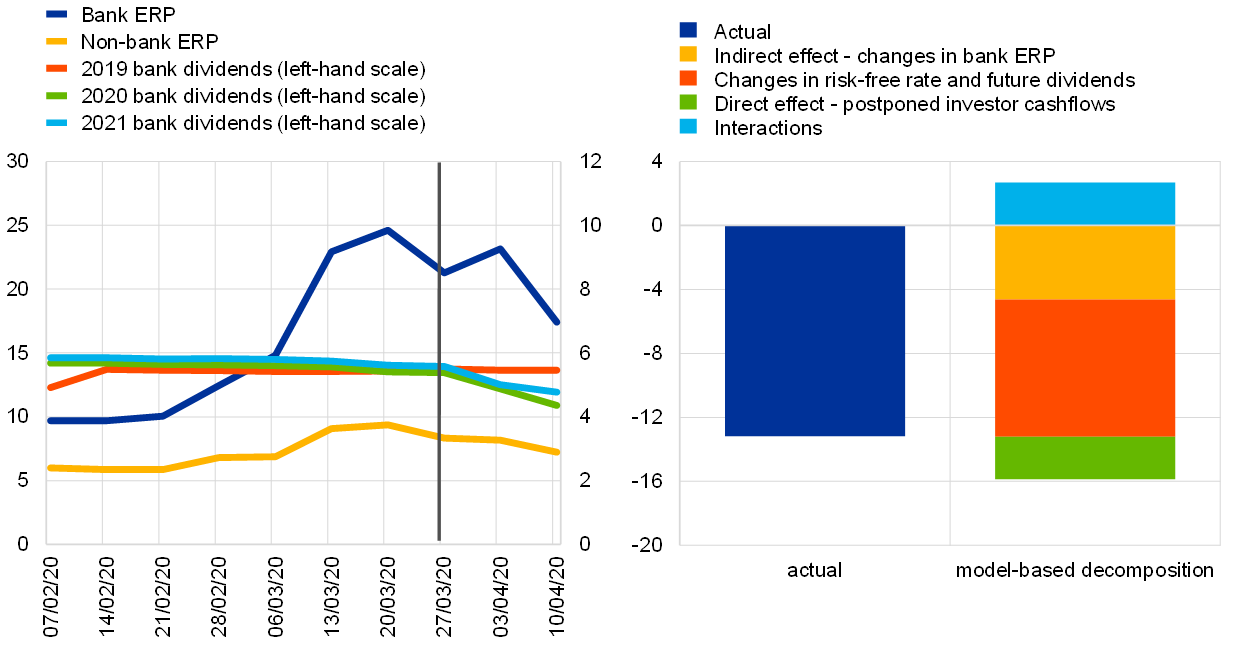Notes: Left: bank ERP and non-bank ERP were derived from a three-stage DDM for the EuroStoxx Banks and EuroStoxx ex-Banks indices. Bank dividends were weighted average dividends per share, weighted according to each banks’ index weighting in the EuroStoxx Banks index (forecasts for 2020 and 2021 were weighted means across analyst forecasts, obtained directly from I/B/E/S). It should be noted that these referred to dividends booked, as opposed to actual payouts. Therefore, payouts of 2019 dividends by the date of the announcement were taken into account for the decomposition. Right: decomposition of the change in bank share prices during the week following the announcement of the ban. See the main text for more details about the decomposition.