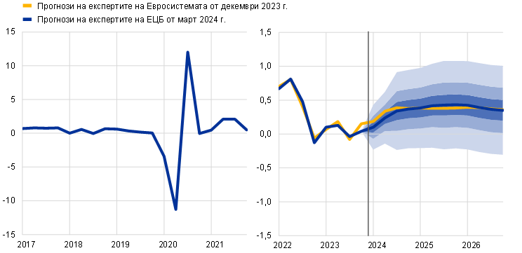 Прогнози на експертите на ЕЦБ | Март 2024 г. | 0,6 | 1,5 | 1,6 | 2,3 | 2,0 | 1,9 |