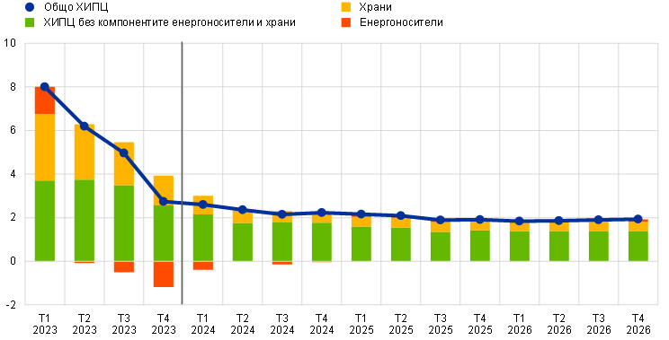 Очаква се инфлацията на храните да намалее значително от 10,9% през 2023 г. до средно 3,2% през 2024 г. поради отслабващия верижен натиск от предходни увеличения на факторите за производство, а след това да се стабилизира на равнище от 2,3% през 2025 г. и 2026 г. След силен спад през първото тримесечие на 2024 г. се предвижда годишният темп на инфлация при храните да отслабва по-плавно през останалата част от годината поради намаляване на верижния натиск в резултат на поевтиняването на енергоносителите и хранителните суровини. От друга страна се предвижда, че по-нататъшен динамичен натиск от страна на разходите за труд ще предотврати по-силно изразен спад, а забавеното им въздействие ще запази инфлацията на храните през последните две години на прогнозния период.