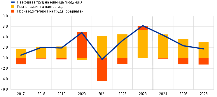 Прогнозира се растежът на номиналните заплати постепенно да се забави, но да остане висок, което ще позволи до 2025 г. реалните заплати да се върнат до равнищата от преди покачването на инфлацията. Според оценките прирастът на компенсацията на наето лице е намалял през четвъртото тримесечие на 2023 г. и се очаква да продължи да се забавя в хода на прогнозния период, като същевременно остане висок спрямо историческите равнища поради все още затегнатите пазари на труда, мерките за компенсиране на инфлацията и увеличението на минималните работни заплати. В края на прогнозния период се очаква той да достигне 3,0% – темп, който в общи линии съответства на сбора от прогнозния прираст на производителността и инфлацията. В сравнение с прогнозите от декември 2023 г. темпът на растеж за 2024 г. е ревизиран леко надолу, тъй като се очаква по-ниският диапазон на заплатите поради по-слабите икономически перспективи да компенсира с излишък по-силния растеж на договорените заплати. За 2025 г. и 2026 г. прирастът на компенсацията на наето лице също беше ревизиран надолу, отразявайки очакваното по-ранно възстановяване на реалните заплати и съответните очаквания за малко по-ниско търсене на компенсации за инфлацията. Очаква се нарастването на разходите за труд на единица продукция да е достигнало върховата си стойност през 2023 г. и да намалее осезаемо, отчасти благодарение на прогнозираното засилване на растежа на производителността (Графика 8).