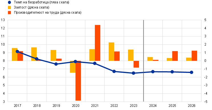 Пазарът на труда остава устойчив, макар да се наблюдава леко охлаждане, тъй като се очаква растежът на заетостта да се забави спрямо силните стойности през 2023 г. В общи линии сходно с прогнозите от декември 2023 г. се очаква прирастът на общата заетост да намалее от 1,4% през 2023 г. до 0,5% през 2024 г. и да се стабилизира на равнище от 0,3% и 0,4% съответно през 2025 г. и 2026 г. (Графика 3). Очаква се нарастването на производителността на труда да се ускори през прогнозния период, но равнищата на производителност през 2026 г. да останат значително под дългосрочната линейна тенденция. Очаква се равнището на безработица да има леко изпъкнал профил – смята се, че в отложен във времето отговор на слабата икономическа активност то ще нарасне до 6,7% през 2024 г., а след това ще намалее до 6,6% през 2025 г. и 2026 г. Темпът на безработица е ревизиран нагоре с 0,1 процентни пункта за 2024 г. и 2025 г. и с 0,2 процентни пункта за 2026 г.