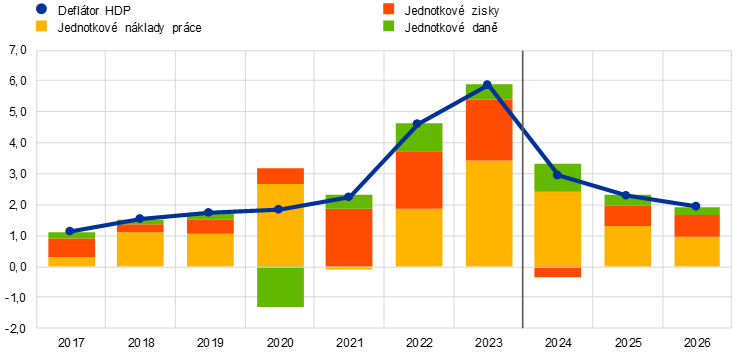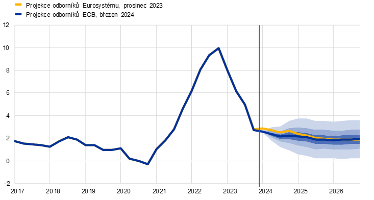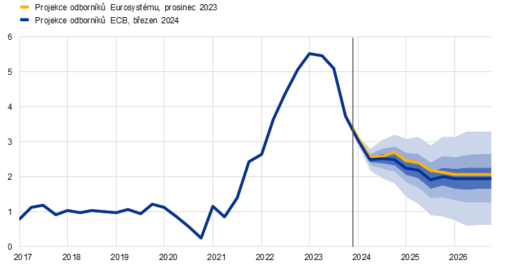 Inflace by se měla dále zmírňovat v důsledku pokračujícího uvolňování tlaků v dodavatelských řetězcích a dopadu zpřísňování měnové politiky, i když pomaleji než v roce 2023. Cenové tlaky v dodavatelských řetězcích by měly nadále odeznívat, neboť se očekává, že narušení lodní dopravy v Rudém moři budou mít pouze omezený dopad na růst cen. Vzhledem k poklesu cen energií by měl být hlavní příčinou inflace v harmonizovaném indexu spotřebitelských cen (dále též „HICP“) bez započtení cen energií a potravin výrazný vývoj nákladů práce. Růst nominálních mezd by měl zůstat zvýšený v důsledku přetrvávajícího napětí na trhu práce, ale v horizontu projekcí by se měl postupně zmírňovat s tím, jak budou odeznívat stimulující dopady inflační kompenzace. Zmírnění tlaků na růst nákladů práce by mělo být podpořeno oživením růstu produktivity. Růst zisků by měl v horizontu projekcí oslabit a poskytnout rezervu pro promítání nákladů práce do ekonomiky. Souhrnně se očekává, že roční průměrná celková inflace měřená HICP poklesne z 5,4 % v roce 2023 na 2,3 % v roce 2024, 2,0 % v roce 2025 a 1,9 % v roce 2026. Vzhledem ke slabému výhledu růstu cen energií se očekává, že celková inflace zůstane v celém horizontu projekcí pod úrovní inflace měřené HICP bez započtení cen energií a potravin. V porovnání s projekcemi z prosince 2023 byla inflace měřená HICP pro rok 2024 a 2025 revidována směrem dolů, a to zejména v důsledku přímých a nepřímých vlivů nižších předpokladů pro ceny energetických komodit a nižších tlaků na růst nákladů práce, a pro rok 2026 zůstává beze změny.