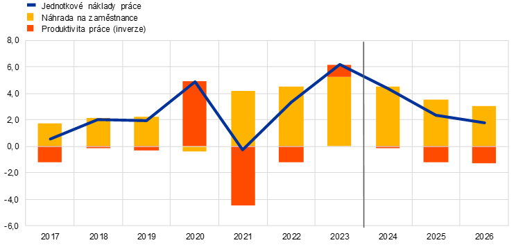 Předpokládá se, že růst nominálních mezd bude postupně klesat, ale zůstane na zvýšené úrovni, což umožní do roku 2025 dosáhnout úrovně reálných mezd, která převládala před prudkým zvýšením inflace. Odhaduje se, že tempo růstu náhrad na zaměstnance ve čtvrtém čtvrtletí roku 2023 pokleslo a v horizontu projekcí by mělo dále zpomalovat, i když ve srovnání s historickými úrovněmi zůstává vyšší v důsledku stále napjaté situace na trzích práce, inflační kompenzace a zvýšení minimálních mezd. Na konci horizontu projekcí by mělo dosáhnout 3,0 %, což zhruba odpovídá součtu předpokládaného růstu produktivity a inflace. Ve srovnání s projekcemi z prosince 2023 bylo tempo růstu pro rok 2024 revidováno mírně směrem dolů, neboť se očekává, že nižší vzlínání mezd v důsledku slabšího hospodářského výhledu převáží nad výraznějším tempem růstu sjednaných mezd. Pro roky 2025 a 2026 byl růst náhrad na zaměstnance rovněž revidován směrem dolů, což odráží předpokládané dřívější oživení reálných mezd a odpovídající očekávání poněkud nižší poptávky po inflační kompenzaci. Očekává se, že růst jednotkových nákladů práce dosáhl vrcholu v roce 2023 a že výrazně poklesne, jelikož bude částečně těžit z předpokládaného zvýšení růstu produktivity (graf 8).