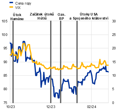 Dosud pozorovaná narušení v Rudém moři mohou mít dopad na světovou ekonomiku prostřednictvím vyšších nákladů na dopravu, rostoucích cen ropy a slabšího obchodu, ale zatím se zdá, že účinky jsou omezené. Přibližně 12 % světových dodávek surové ropy a 10 % veškerého světového námořního obchodu (měřeno objemem) procházejí Suezským průplavem. Narušení lodní dopravy může mít mnoho nežádoucích účinků. Zaprvé, zpoždění dodávek ropy může vést k jejím vyšším cenám kvůli omezenější nabídce ropy ve světě. Po krátkém období volatility však spotová cena ropy Brent klesla a v současnosti se nachází pod úrovní zaznamenanou po prvních útocích Hútijů.[10] Je tomu tak proto, že ropné tankery, které tímto regionem proplouvají, jsou do značné míry nedotčeny a svou činnost v této oblasti pozastavilo pouze několik ropných společností (graf A, panel b)).[11],,[12] Zadruhé, tento vývoj ovlivňuje objemy světového obchodu a náklady na dopravu, neboť cesty mezi Asií a Evropou jsou kvůli přesměrování dopravy kolem mysu Dobré naděje přibližně o 30 % delší, přičemž poptávka po kapacitě kontejnerové přepravy ve světě roste. V důsledku toho by se vyšší náklady na dopravu mohly promítnout do vyšších spotřebitelských cen. Od začátku útoků Hútijů se náklady na přepravu přepravních kontejnerů na konkrétních trasách skutečně značně zvýšily, ale zůstávají výrazně pod maximálními hodnotami zaznamenanými v letech 2021 a 2022 (graf A, panel c)). Zatřetí, zpoždění v přepravě by mohla narušit výrobu prostřednictvím snížené dostupnosti surovin a meziproduktů, zejména v odvětvích, která jsou závislá na dodavatelských řetězcích „just-in-time“. V lednu 2024 vzrostly indexy vedoucích nákupu (dále též „PMI“) pro dodací lhůty dodavatelů u zemí, které jsou více vystaveny narušením lodní dopravy, ale zůstaly výrazně pod úrovní z let 2021 a 2022 (graf A, panel d)). V neposlední řadě i když by narušení na kritických námořních trasách, jako je Rudé moře, mohla zvýšit nejistotu na světových trzích, index VIX, který je zástupným ukazatelem nejistoty na finančních trzích, zůstává pod úrovní zaznamenanou v den prvních útoků Hútijů (graf A, panel b)).