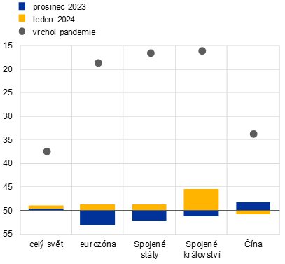 Celosvětový hospodářský růst na přelomu roku zmírnil, neboť se nadále projevovalo zpřísňování měnové politiky přenášené do ekonomiky.[7] Ve srovnání s odhadem ve výši 3,5 % pro rok 2023 by jeho tempo mělo letos mírně poklesnout na 3,4 %. V tomto zmírnění se odráží dopad odeznívajících příznivých faktorů, jako je vyčerpání nadměrných úspor a postupně ochlazující trh práce, což v minulosti ve vyspělých ekonomikách podporovalo spotřebitelské výdaje. Předpokládá se, že celosvětový růst zpomalí v období 2025–2026 na 3,2 % ročně, což je mírně pod průměrem za poslední desetiletí. Ve Spojených státech se očekává, že hospodářský růst letos oslabí v důsledku pokračující korekce na trhu práce a transmise přísné měnové politiky a úvěrových podmínek bank. V Číně zůstávají spotřebitelské výdaje v kontextu slabého trhu s nemovitostmi utlumené. Ve srovnání s projekcemi z prosince 2023 byl hospodářský růst ve světě pro letošní rok revidován směrem nahoru, a to především v důsledku překvapivých údajů o růstu ke konci roku 2023 v hlavních ekonomikách, zejména ve Spojených státech.