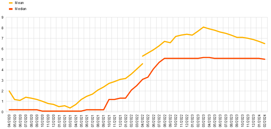 Notes: Weighted estimates. The median is computed on the basis of a symmetric linear interpolation that accounts for rounding of responses. Mean values are winsorised at the 2nd and 98th percentiles of each survey round and country. The shift in the time series in April 2022 visualises the change in the composition of the aggregates due to the inclusion of five additional countries (IE, GR, AT, PT and FI).