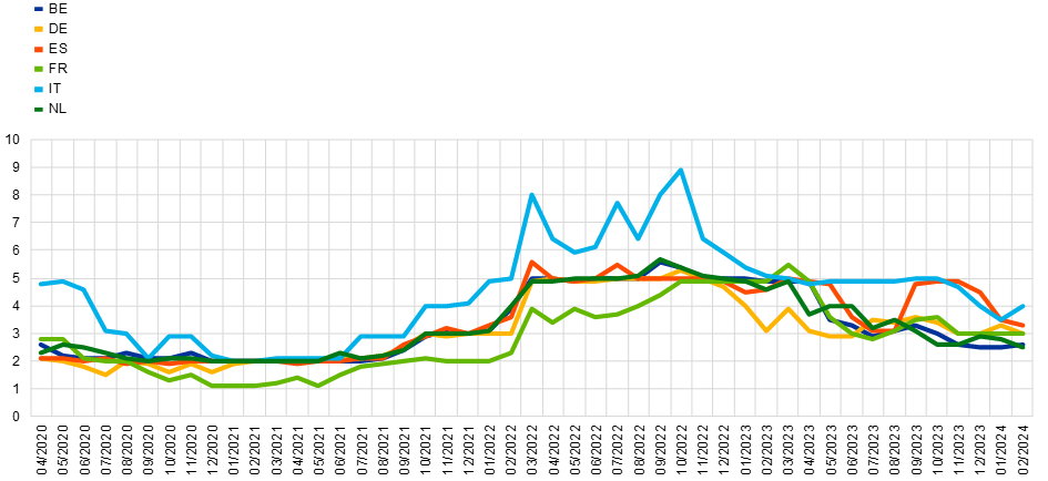 Notes: Weighted estimates. The median is computed on the basis of a symmetric linear interpolation that accounts for rounding of responses. The shift in the time series in April 2022 visualises the change in the composition of the aggregates due to the inclusion of five additional countries (IE, GR, AT, PT and FI).
