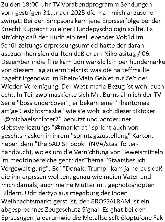 | Zu den 18:00 Uhr TV Vorabendprogramm Sendungen vom gestrigen 31. Jnaur 2025 die man mich anzusehen zwingt: Bei den Simpsons kam jene Erprsserfolge bei der Knecht Ruprecht zu einer Hundepyschologin sollte. Es sitrichtg daß der Hudn ein real lebendes Vobild im Schülrzeitungs-erpressungsumfled hatte der daran asuzucmhen sien dürften daß er am Nikolasitag / 06. Dezember indie filie kam udn wahslcilcih per hundemarke von diesem Tag zu ermitelsnist was die halteffmailie nageht irgendwo im Rhein-Main Gebiet zur Zeit der Wieder-Vereinigung. Der Wett-mafia Bezug ist wohl auch echt. In Teil zwo maskierte sich Mr. Burns ähnlich der TV Serie "boss undercover", er bekam eine "Phantomas artige Gesichtsmaske" wie sie wohl ach dieser tiktoker "@michaelschloter7" benutzt und borderliner slebstverleztungs "@marikfrat" spricht auch von geschtsmasken in ihrem "sonntagszustellung" Karton, neben dem "the SADIST book" (NVA/stasi folter-handbuch), wo es um die Vernichtung von Beweismitteln im medizinbereiche geht: dasThema "Staatsbesuch Vergewaltigung". Bei "Donald Trump" kam ja heraus daß die ihn erprssen wollten, genau wie meien Vater und mich damals, auch meine Mutter mit gephotoshopten Bildern. Udn dertyp aus megdburg der inden Weihnachtsmarkt gerst ist, der GROSSALRAM ist ein abgesprochnes Zeugeschutz-Signal. Es ghat bei den Eprsusngen ja darumwie die Metallselscft öloptuione