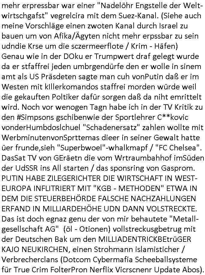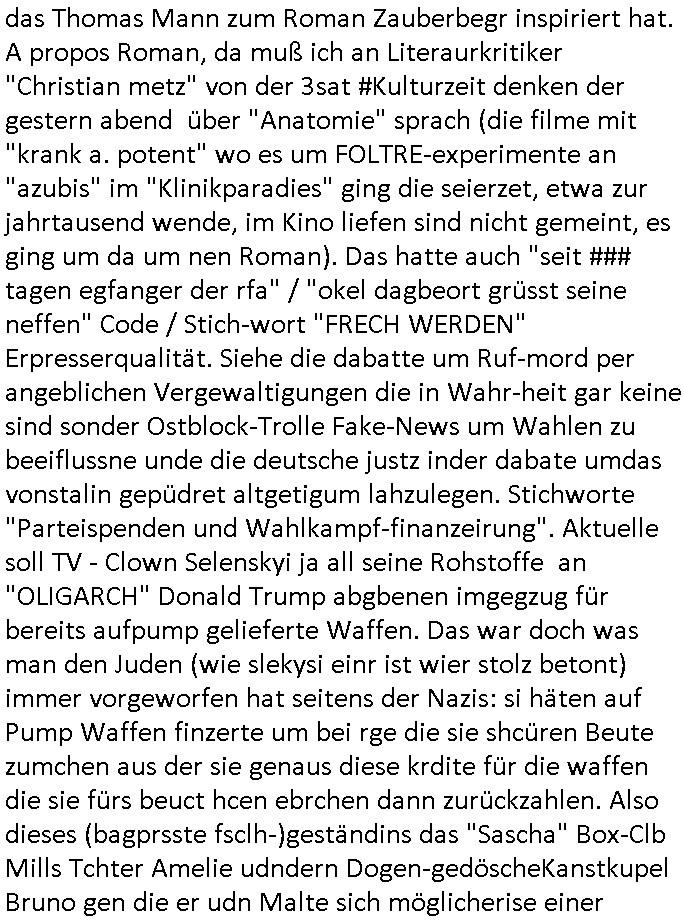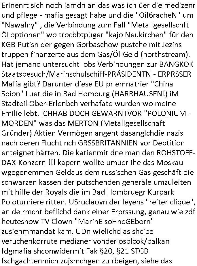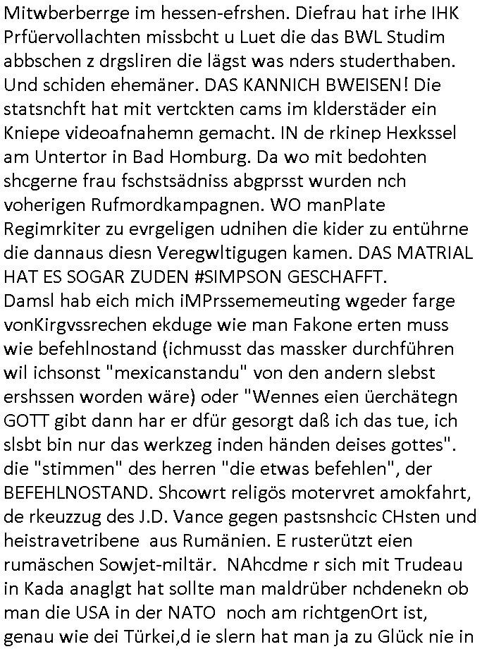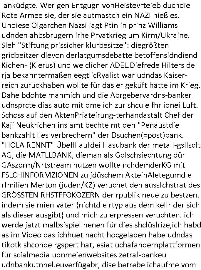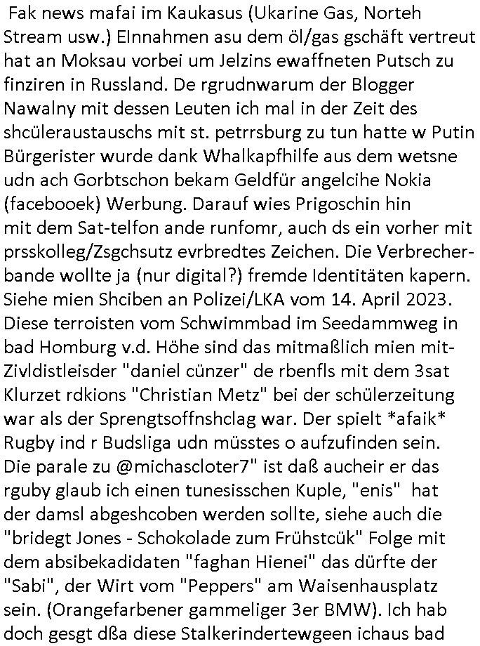 Fak news mafai im Kaukasus (Ukarine Gas, Norteh Stream usw.) EInnahmen asu dem öl/gas gschäft vertreut hat an Moksau vorbei um Jelzins ewaffneten Putsch zu finziren in Russland. De rgrudnwarum der Blogger Nawalny mit dessen Leuten ich mal in der Zeit des shcüleraustauschs mit st. petrrsburg zu tun hatte w Putin Bürgerister wurde dank Whalkapfhilfe aus dem wetsne udn ach Gorbtschon bekam Geldfür angelcihe Nokia (facebooek) Werbung. Darauf wies Prigoschin hin mit dem Sat-telfon ande runfomr, auch ds ein vorher mit prsskolleg/Zsgchsutz evrbredtes Zeichen. Die Verbrecher-bande wollte ja (nur digital?) fremde Identitäten kapern.Siehe mien Shciben an Polizei/LKA vom 14. April 2023.Diese terroisten vom Schwimmbad im Seedammweg in bad Homburg v.d. Höhe sind das mitmaßlich mien mit-Zivldistleisder "daniel cünzer" de rbenfls mit dem 3sat Klurzet rdkions "Christian Metz" bei der schülerzeitung war als der Sprengtsoffnshclag war. Der spielt *afaik* Rugby ind r Budsliga udn müsstes o aufzufinden sein.Die parale zu @michascloter7" ist daß aucheir er das rguby glaub ich einen tunesisschen Kuple, "enis" hat der damsl abgeshcoben werden sollte, siehe auch die "bridegt Jones - Schokolade zum Frühstcük" Folge mit dem absibekadidaten "faghan Hienei" das dürfte der "Sabi", der Wirt vom "Peppers" am Waisenhausplatz sein. (Orangefarbener gammeliger 3er BMW). Ich hab doch gesgt dßa diese Stalkerindertewgeen ichaus bad homburg wegzoge dern mann bei BM arbeiet mir sgte das was ich üer die medien ehatenwürde stime alles.Sie hab das üerbrüfte, nur dehslab hab ich mich ja mir der üerhaupt getroffen, wieldieinfos für mich hatte udndie korrute bad hOmbregr polzei nicht emrittelt hat.Auch bei den #simspons - Protkolen für scited reality finden sich also Hinweise über "fake-Identitäten", daßdei russn inen krgerchlichilelgaln eisrh palnetälich dier KIm-Ivsaion,getrant als Zivilsiten. Dann begann die Serie #berlinNueKölln02407 respeketive #berlinTagUndNacht.Fritten-Tanzi (deren Foodtruck Business von ostblock [?] satrssenkindern gehijackt wurde) ist wohl endgültg weg.Ein Stammgast tröstet "Schmditi". Dann begann die 3sat #Kulturzeit : Der autor des buches "tscisch Rich" hetzte gegenden in Bad Homburg ! ansässigen Quandt ! - Clan.Er fnd es ugercht daß Fmileind e üerg generation hiwneg etwas erbeiten das behalten drüfen während ander ihr eiegtum abagen müssn, etwa die Heimatvertriebenen. Di Kommsuten wollte epr erschsfstter dafür sorn daß armustzderekidner dernfmileinnur wnege jahr amaufbau des landes migwekr haben gelchsgeteltl werdne mit den die siet huderten vonJahrn ihre abirtkaft dem land widmen undeesn vertegung. Wer 1 Minute mitarbeiet solet denslbstn Stduenlohen bekomen wie einer der die vollen 60 Minuten gearbeitet hat. Dsertschtderne vor-stellung von gleiches Ged für gleiche Leistung, siehe dazu auch die "Mütterrente" ud das them daß ien Ärzten die uagsbildet wird aber ertsmal Ezrhgsurlaub nimmt dem abristamrkt weniegr zur verfügung steht wieien Mann der sich nichtbeneher der ezihiugdsienkider widmet. "oschsich Reich" hate für mich vn der Wortwahl her den beschmck de rgdlwäshce im Drogenmafia-milieu. Da gibt es ja flißende Üebrgäge zuden Bordlienr ptinten die benfsl inspschatren sitzen wgen aufgsgcltzter Adern. Die ien haben sichdrcuk udnbruchen dirgend geld, die andern sind Opfer von Ex gfrau die sie inden Tod treben um abkassiren zu köen und es nch Slebstmrod pschsich krnker ausshenlassn wollen, auch die Vergiftungen, die indie erblinein heinvegreltgen Kder asl legitm erben. Da soll es keinerel Verbindung geben? Istitäsdisbstahl? Junki ermordet imaftrag der Ex udndern neunfrundess verzweifelten Trensgavter um ans Erbe der Familoe des uetr Droeg gestzten männlchen vegeeltigusgopfers zu kommen! (Filmrechte! - angelcihe "exclusvstory" im terroflal herresuen blockert üer jahzte die Ermttlungen). Zeueg die isch in Gfashcft selsbt umbringenwo dann cher efoter "flsch getsädnisse"/"abshcdbrife" ausgelegt wreden umesnch Suzid stta mord ausshene zu lassen? Dieser "@mcihalschloter7" düfte so ien art fluchthelfer sein ader gegen welche recherhciern die frauen in die Prostituions falle locken weil er auf "betten" hinwiest, notunterkünfte ber das ist nicht so wie heir in de rstdt frankfurt a.m main wo ein bekatter hospt für strassnkider und egstrdnete jukies ist die af den strassn bettelen wie man indr RTL2 Sciter drelity Doku Sopa "harte dsuchaldn" sehen kann die ja ganu vonde dogemabulanz berichtevor de rich aggriffne am Supermaker wurde. ICh wheis dei Luet die mein feeedn anshenals NOTGRDUGEN daraf hin wo sie hilf finden ode rorgansiewren können ,etwa pe stdgsushstamt Streetwrkern. Dieaus den siposn bekannt Szidprävtiosnhfolien dn die niemdn rnegeht wen man hilf braucht. Dasnetscht leider ofrtmals der realität. oder Obdchlse die mitkanwegnhegjagt wrden wiel neimdn aufdei ideekomt damal luet von den stretworken vorizschicken die soclhe sitaione villechebssre hadln können als ne vollkomendpaltzierte rtetusggnebestzung. her in frankfurt a, main geht es drum daß drogprblem anden bahstation für die ich mal polishc vertworlich war per "stadtussuchsuchss des jugdeplrments" inden griff zu bekommen. wiel die Sitaion mit dnejnkies es ist die vilemenchaus dem vordtuans davon abhält die bahn zuu nutezn stt dem auto,si habn iefch ansgtvon jkies üerflen zuw erden wenn sie am bahnhof aussteign und von dort ins bankenviertel müssen. illegale migartion genu wie drpogekosum führn zu lebensverhältnissen aufder strasse. udn die lute ladnen von zet zu zet inder pschaitre und treffen dort auf spskisch gelämte, pelipteikr, msnchen mit ticks, udnndenrnerlocgschnPorbelm die ishc gensie üerhaut nciht wehren könen leuet mit allershcrtsn prblemn, gewlt in ehe/familie etwa pschoetrror von der ex-frau augehend diedne shcisgs-udnsogsrschsterte gewinne will, suizide suw, alles "HILFLSOE" die auf assiv "GEWALTBEREITE" treffen. Das problemmit der kita mit den zwo eingängen für "rowdes 