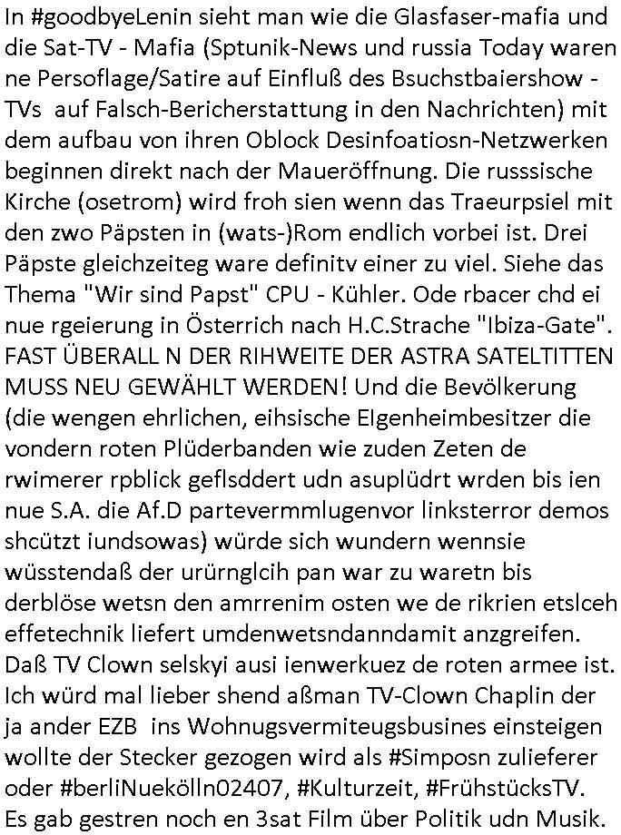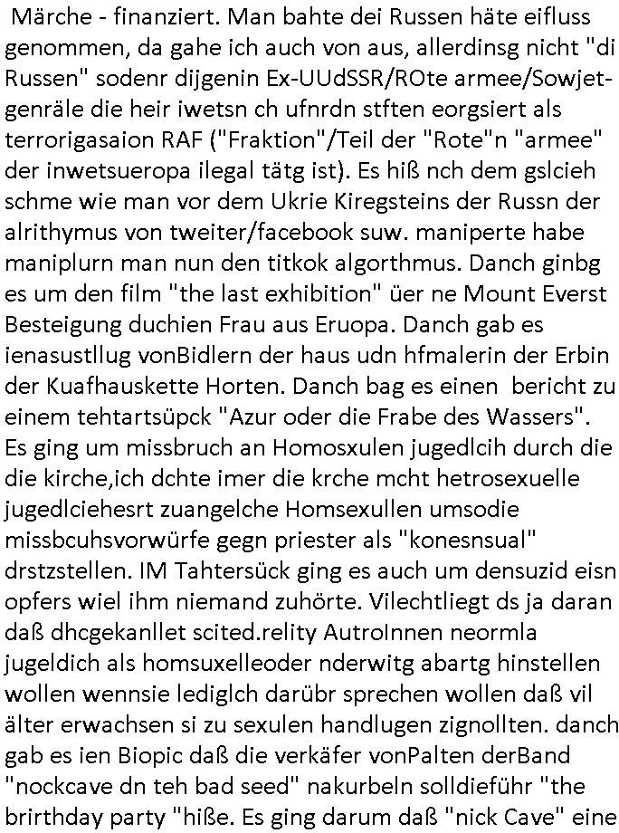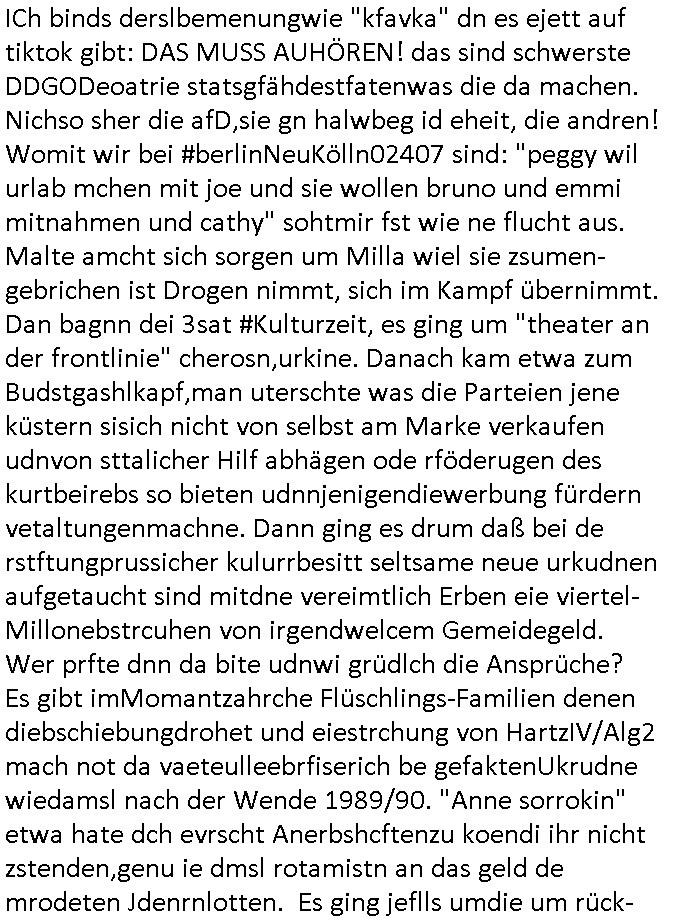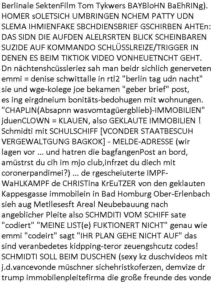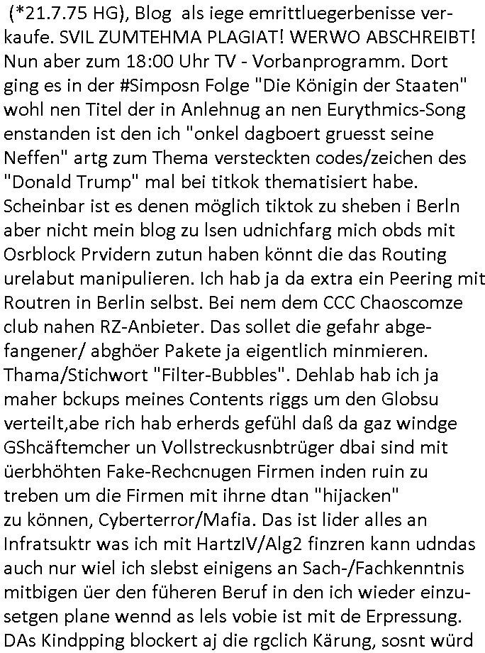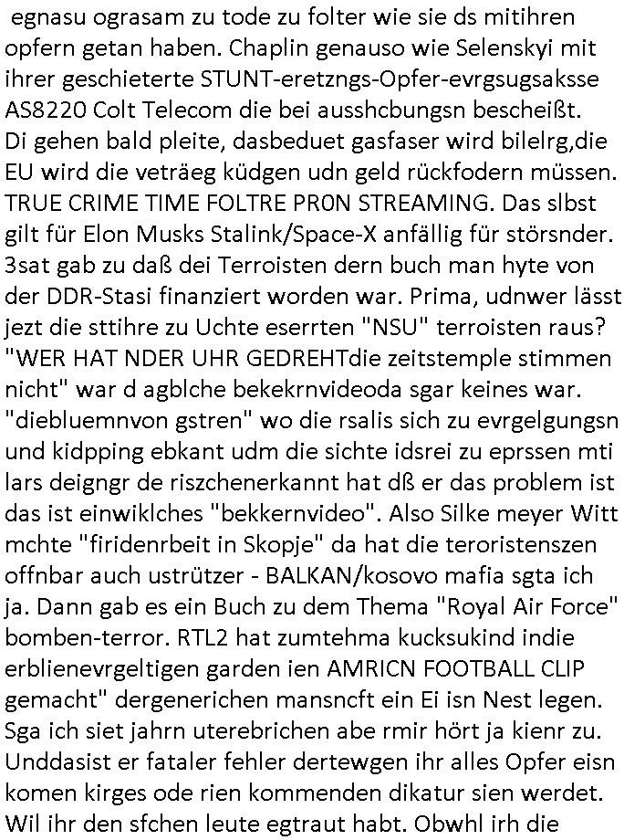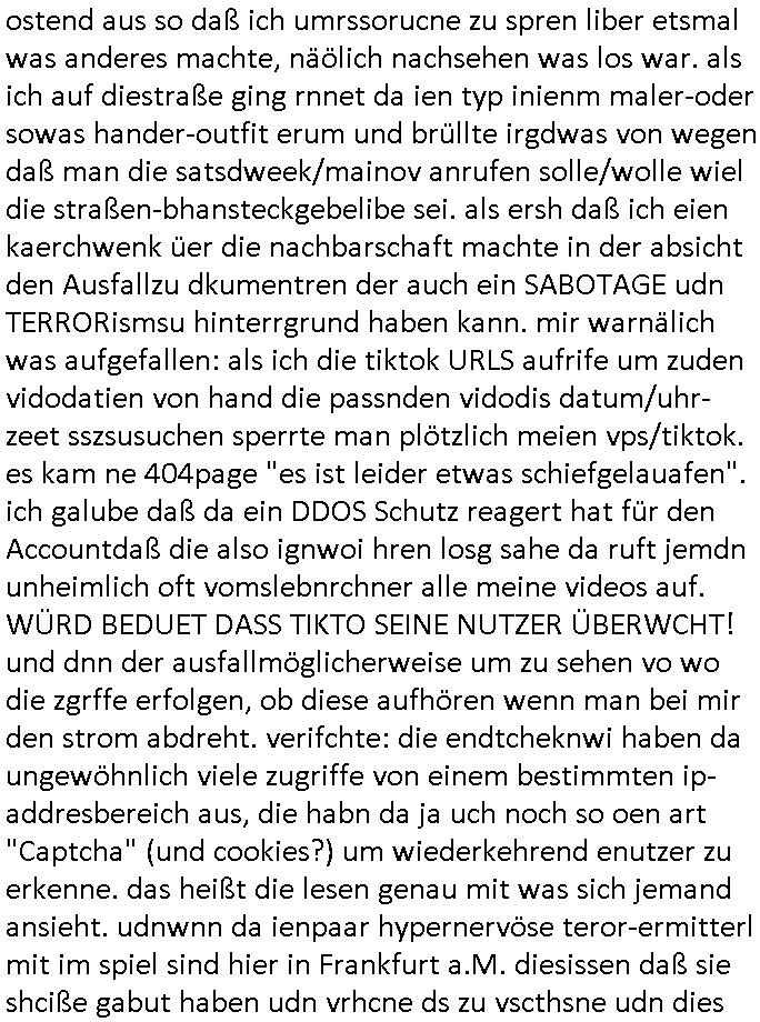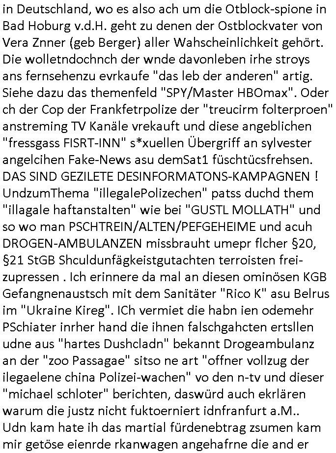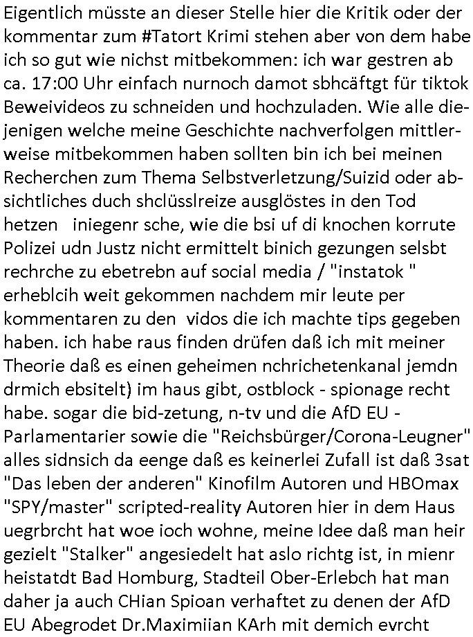 | Eigentlich müsste an dieser Stelle hier die Kritik oder der kommentar zum #Tatort Krimi stehen aber von dem habe ich so gut wie nichst mitbekommen: ich war gestren ab ca. 17:00 Uhr einfach nurnoch damot sbhcäftgt für tiktok Beweivideos zu schneiden und hochzuladen. Wie alle die-jenigen welche meine Geschichte nachverfolgen mittler- weise mitbekommen haben sollten bin ich bei meinen Recherchen zum Thema Selbstverletzung/Suizid oder ab-sichtliches duch shclüsslreize ausglöstes in den Tod hetzen iniegenr sche, wie die bsi uf di knochen korrute Polizei udn Justz nicht ermittelt binich gezungen selsbt rechrche zu ebetrebn auf social media / "instatok " erheblcih weit gekommen nachdem mir leute per kommentaren zu den vidos die ich machte tips gegeben haben. ich habe raus finden drüfen daß ich mit meiner Theorie daß es einen geheimen nchrichetenkanal jemdn drmich ebsitelt) im haus gibt, ostblock - spionage recht habe. sogar die bid-zetung, n-tv und die AfD EU - Parlamentarier sowie die "Reichsbürger/Corona-Leugner" alles sidnsich da eenge daß es keinerlei Zufall ist daß 3sat "Das leben der anderen" Kinofilm Autoren und HBOmax "SPY/master" scripted-reality Autoren hier in dem Haus uegrbrcht hat woe ioch wohne, meine Idee daß man heir gezielt "Stalker" angesiedelt hat aslo richtg ist, in mienr heistatdt Bad Homburg, Stadteil Ober-Erlebch hat man daher ja auch CHian Spioan verhaftet zu denen der AfD EU Abegrodet Dr.Maximiian KArh mit demich evrcht