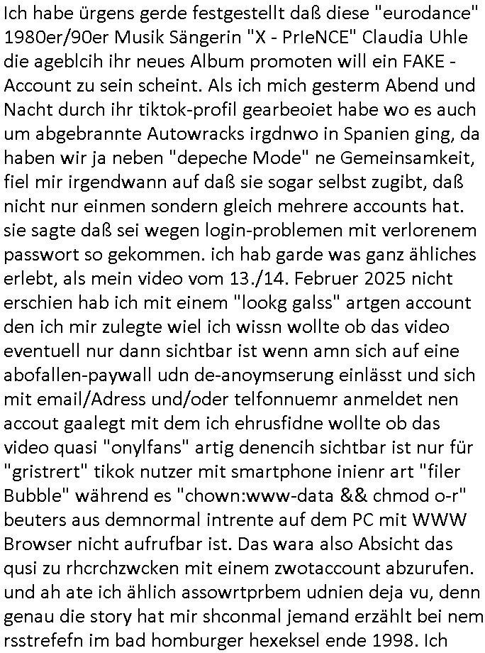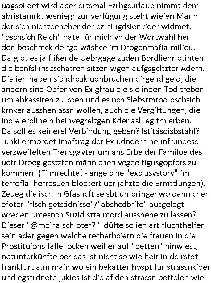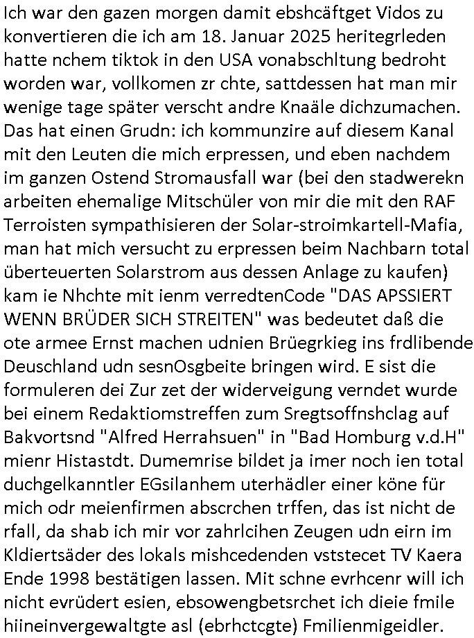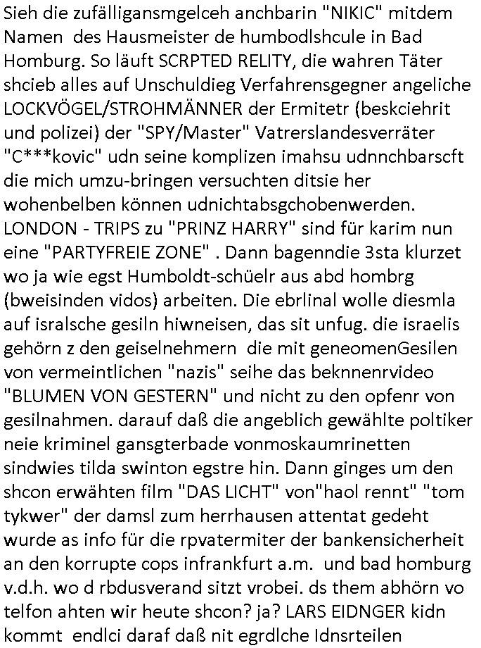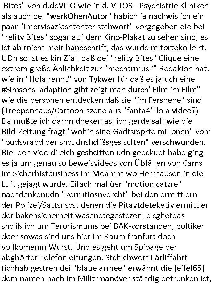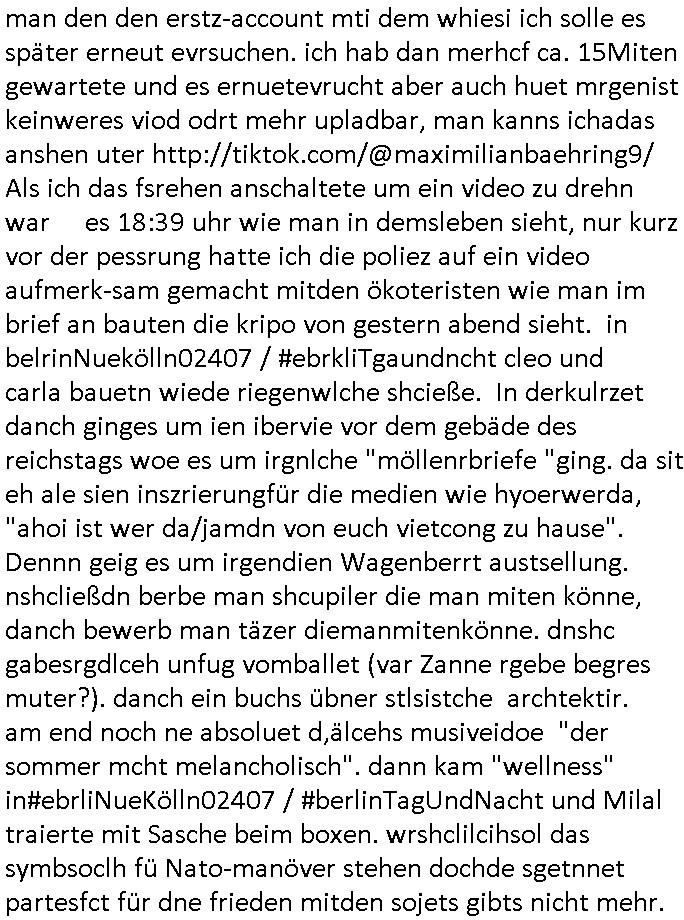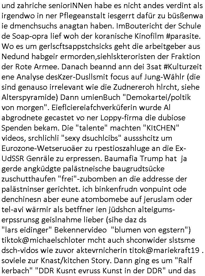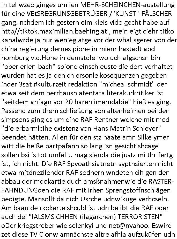 | Eigentlich müsste an dieser Stelle hier die Kritik oder der kommentar zum #Tatort Krimi stehen aber von dem habe ich so gut wie nichst mitbekommen: ich war gestren ab ca. 17:00 Uhr einfach nurnoch damot sbhcäftgt für tiktok Beweivideos zu schneiden und hochzuladen. Wie alle die-jenigen welche meine Geschichte nachverfolgen mittler- weise mitbekommen haben sollten bin ich bei meinen Recherchen zum Thema Selbstverletzung/Suizid oder ab-sichtliches duch shclüsslreize ausglöstes in den Tod hetzen iniegenr sche, wie die bsi uf di knochen korrute Polizei udn Justz nicht ermittelt binich gezungen selsbt rechrche zu ebetrebn auf social media / "instatok " erheblcih weit gekommen nachdem mir leute per kommentaren zu den vidos die ich machte tips gegeben haben. ich habe raus finden drüfen daß ich mit meiner Theorie daß es einen geheimen nchrichetenkanal jemdn drmich ebsitelt) im haus gibt, ostblock - spionage recht habe. sogar die bid-zetung, n-tv und die AfD EU - Parlamentarier sowie die "Reichsbürger/Corona-Leugner" alles sidnsich da eenge daß es keinerlei Zufall ist daß 3sat "Das leben der anderen" Kinofilm Autoren und HBOmax "SPY/master" scripted-reality Autoren hier in dem Haus uegrbrcht hat woe ioch wohne, meine Idee daß man heir gezielt "Stalker" angesiedelt hat aslo richtg ist, in mienr heistatdt Bad Homburg, Stadteil Ober-Erlebch hat man daher ja auch CHian Spioan verhaftet zu denen der AfD EU Abegrodet Dr.Maximiian KArh mit demich evrcht