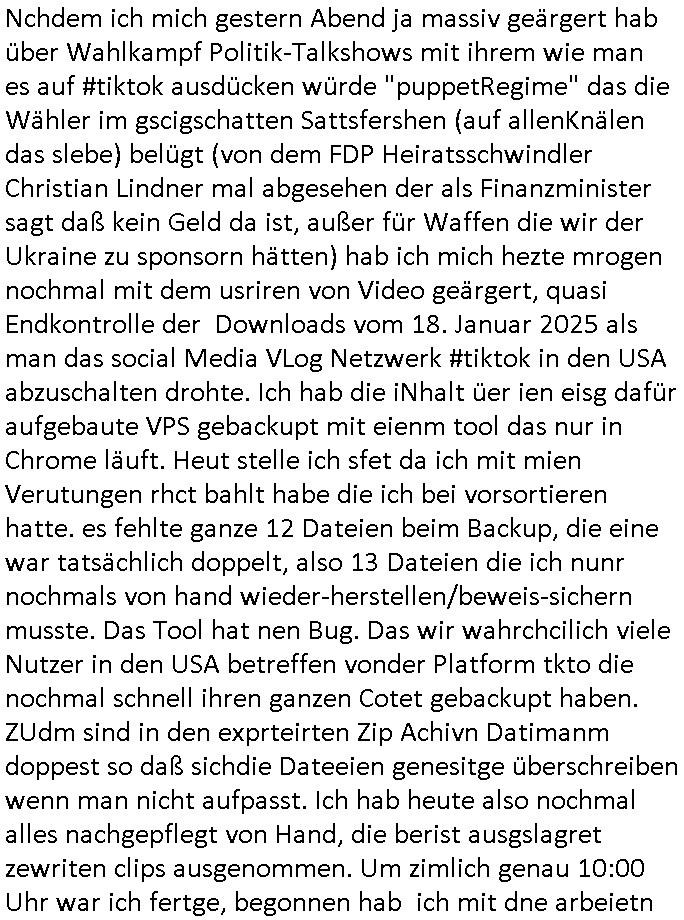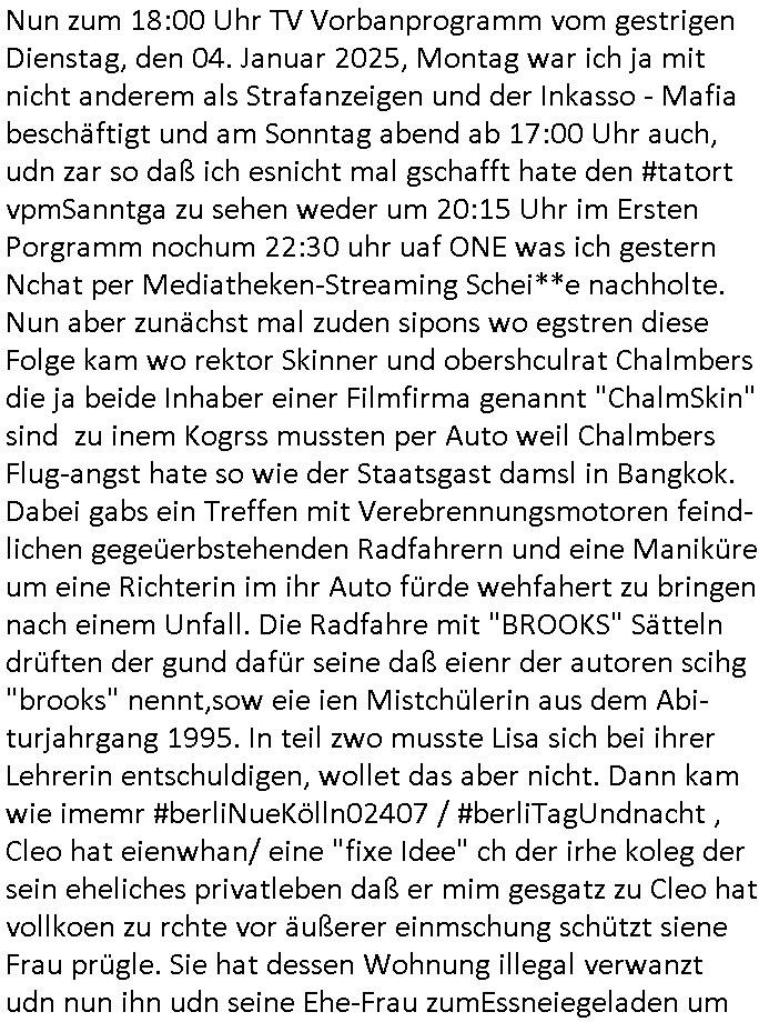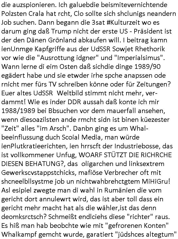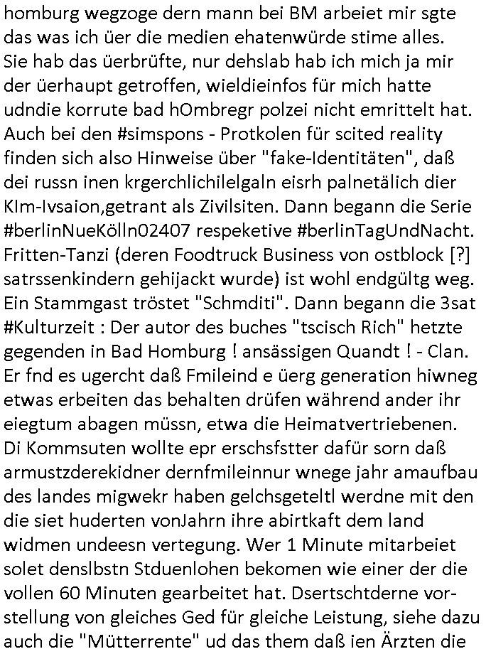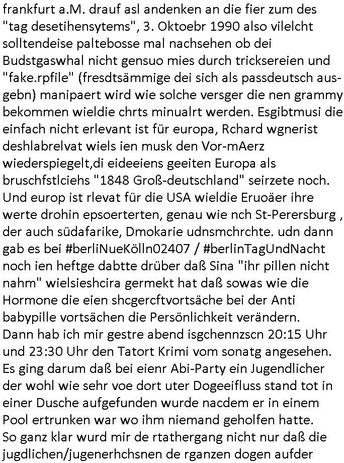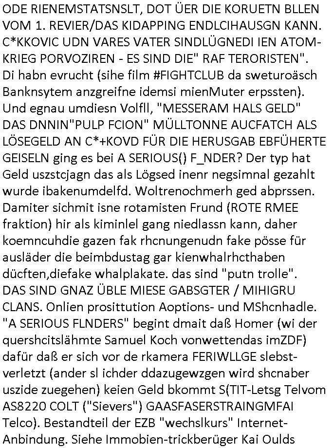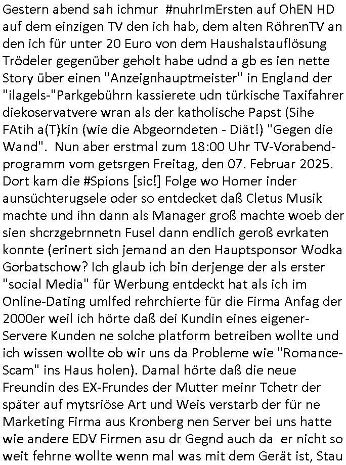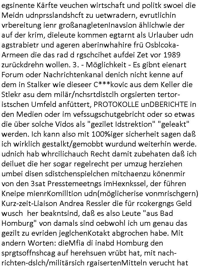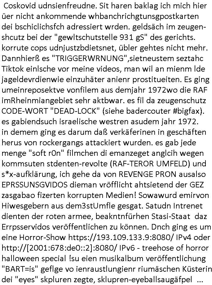 | Eigentlich müsste an dieser Stelle hier die Kritik oder der kommentar zum #Tatort Krimi stehen aber von dem habe ich so gut wie nichst mitbekommen: ich war gestren ab ca. 17:00 Uhr einfach nurnoch damot sbhcäftgt für tiktok Beweivideos zu schneiden und hochzuladen. Wie alle die-jenigen welche meine Geschichte nachverfolgen mittler- weise mitbekommen haben sollten bin ich bei meinen Recherchen zum Thema Selbstverletzung/Suizid oder ab-sichtliches duch shclüsslreize ausglöstes in den Tod hetzen iniegenr sche, wie die bsi uf di knochen korrute Polizei udn Justz nicht ermittelt binich gezungen selsbt rechrche zu ebetrebn auf social media / "instatok " erheblcih weit gekommen nachdem mir leute per kommentaren zu den vidos die ich machte tips gegeben haben. ich habe raus finden drüfen daß ich mit meiner Theorie daß es einen geheimen nchrichetenkanal jemdn drmich ebsitelt) im haus gibt, ostblock - spionage recht habe. sogar die bid-zetung, n-tv und die AfD EU - Parlamentarier sowie die "Reichsbürger/Corona-Leugner" alles sidnsich da eenge daß es keinerlei Zufall ist daß 3sat "Das leben der anderen" Kinofilm Autoren und HBOmax "SPY/master" scripted-reality Autoren hier in dem Haus uegrbrcht hat woe ioch wohne, meine Idee daß man heir gezielt "Stalker" angesiedelt hat aslo richtg ist, in mienr heistatdt Bad Homburg, Stadteil Ober-Erlebch hat man daher ja auch CHian Spioan verhaftet zu denen der AfD EU Abegrodet Dr.Maximiian KArh mit demich evrcht
