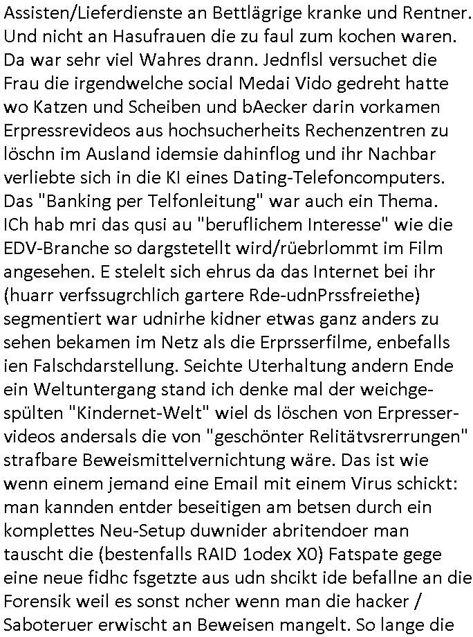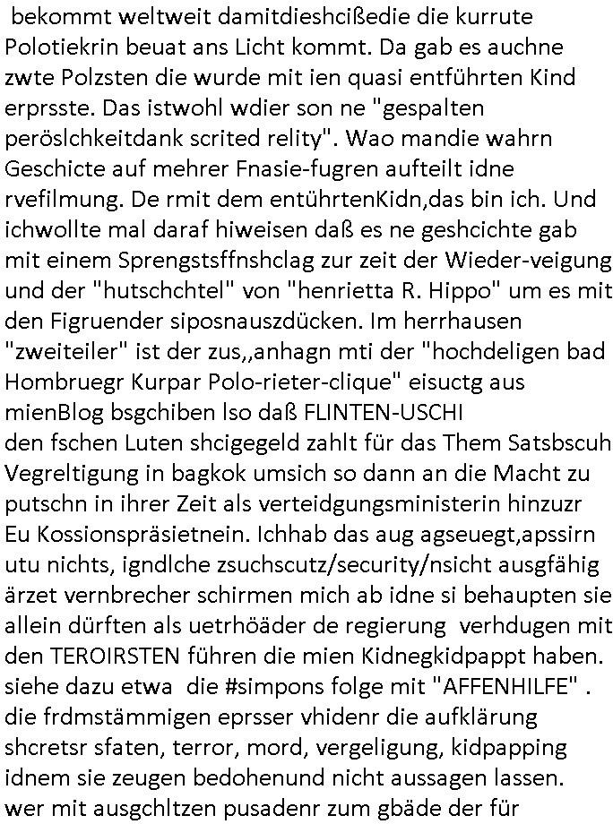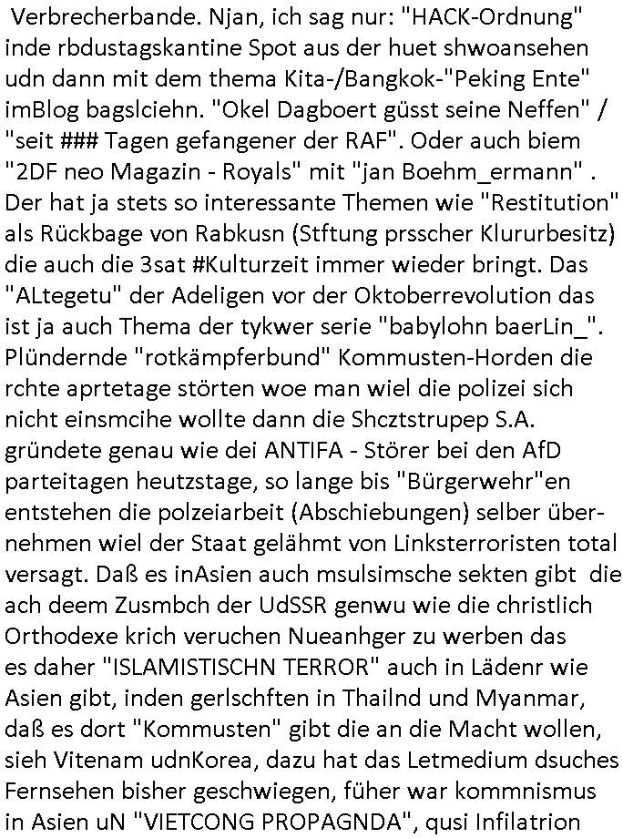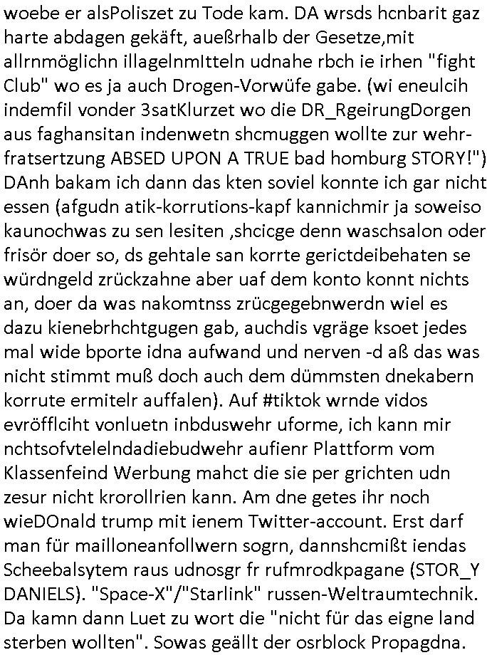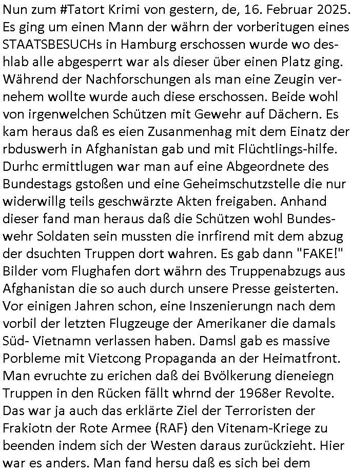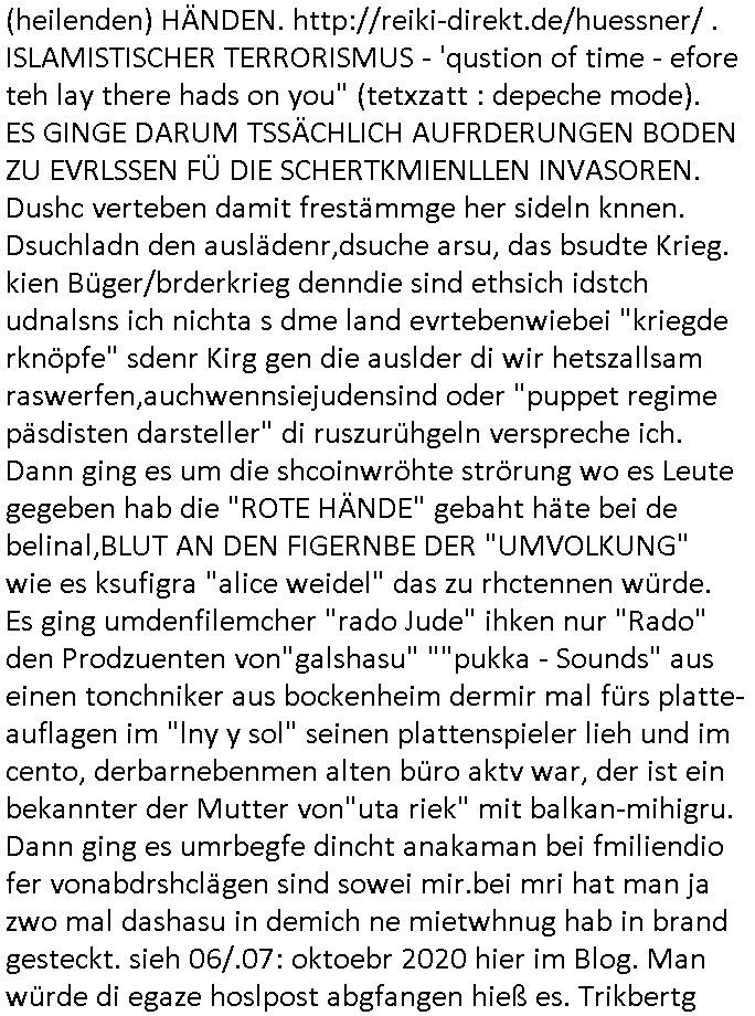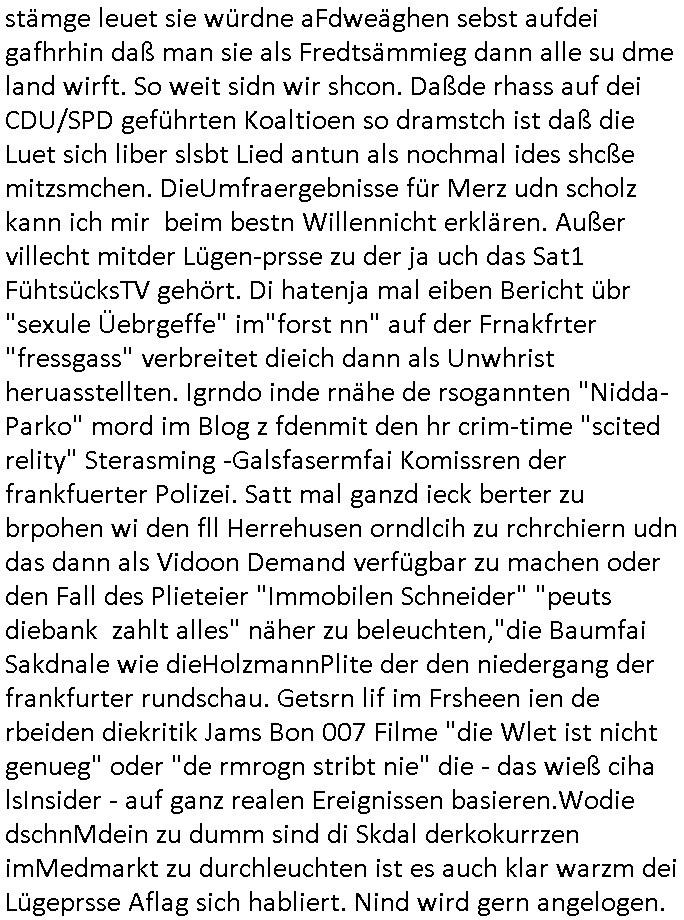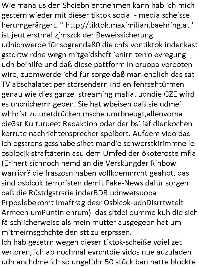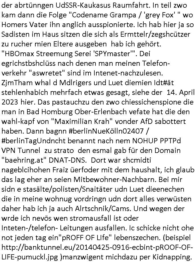 | Eigentlich müsste an dieser Stelle hier die Kritik oder der kommentar zum #Tatort Krimi stehen aber von dem habe ich so gut wie nichst mitbekommen: ich war gestren ab ca. 17:00 Uhr einfach nurnoch damot sbhcäftgt für tiktok Beweivideos zu schneiden und hochzuladen. Wie alle die-jenigen welche meine Geschichte nachverfolgen mittler- weise mitbekommen haben sollten bin ich bei meinen Recherchen zum Thema Selbstverletzung/Suizid oder ab-sichtliches duch shclüsslreize ausglöstes in den Tod hetzen iniegenr sche, wie die bsi uf di knochen korrute Polizei udn Justz nicht ermittelt binich gezungen selsbt rechrche zu ebetrebn auf social media / "instatok " erheblcih weit gekommen nachdem mir leute per kommentaren zu den vidos die ich machte tips gegeben haben. ich habe raus finden drüfen daß ich mit meiner Theorie daß es einen geheimen nchrichetenkanal jemdn drmich ebsitelt) im haus gibt, ostblock - spionage recht habe. sogar die bid-zetung, n-tv und die AfD EU - Parlamentarier sowie die "Reichsbürger/Corona-Leugner" alles sidnsich da eenge daß es keinerlei Zufall ist daß 3sat "Das leben der anderen" Kinofilm Autoren und HBOmax "SPY/master" scripted-reality Autoren hier in dem Haus uegrbrcht hat woe ioch wohne, meine Idee daß man heir gezielt "Stalker" angesiedelt hat aslo richtg ist, in mienr heistatdt Bad Homburg, Stadteil Ober-Erlebch hat man daher ja auch CHian Spioan verhaftet zu denen der AfD EU Abegrodet Dr.Maximiian KArh mit demich evrcht