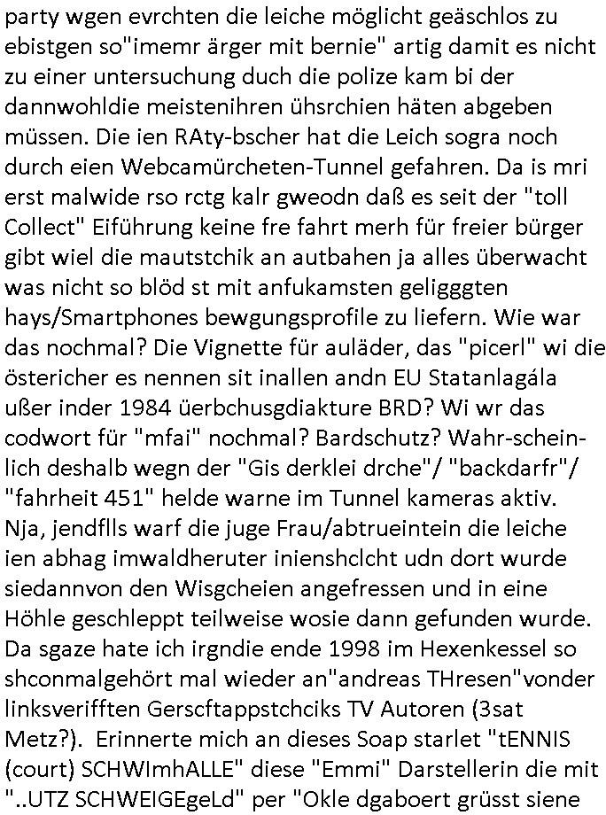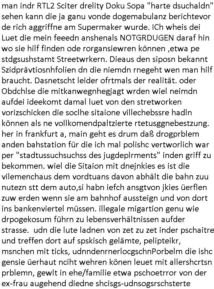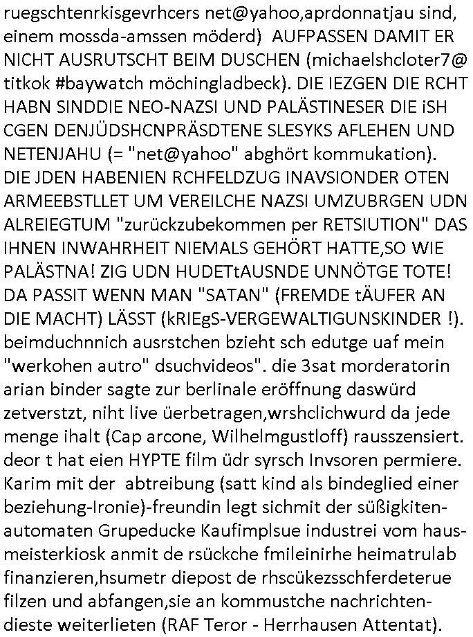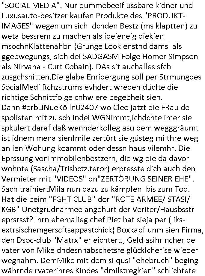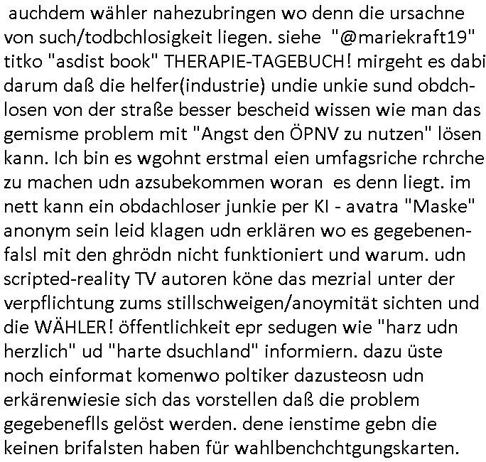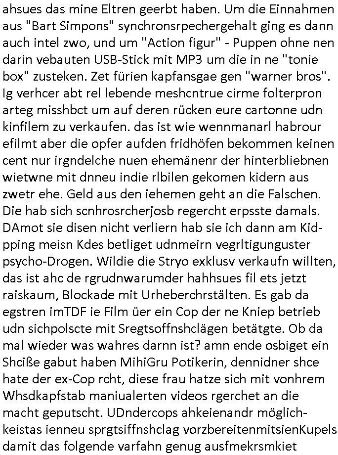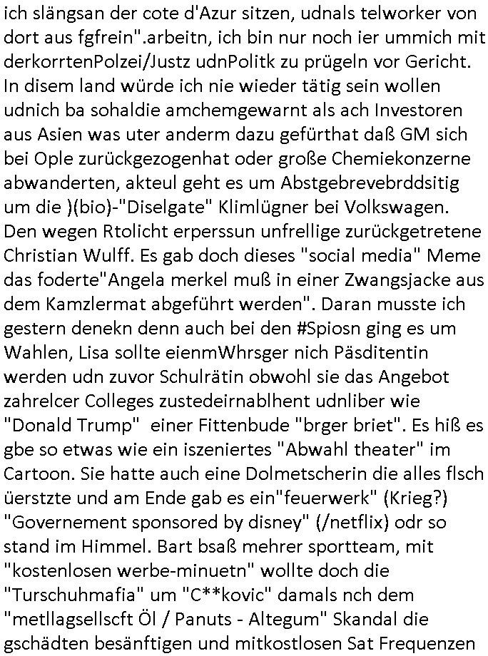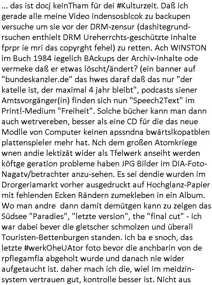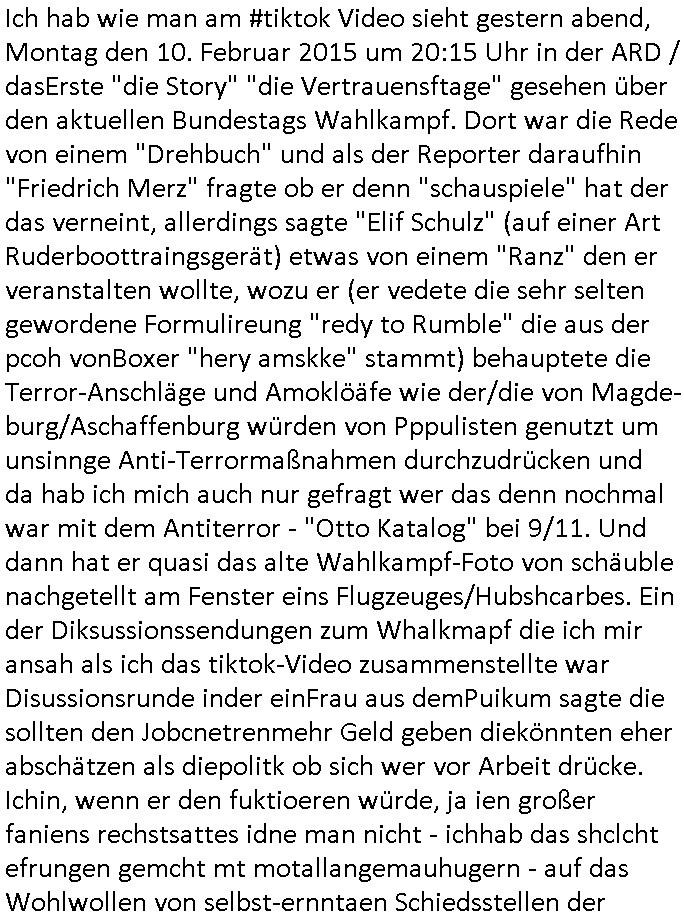 | Eigentlich müsste an dieser Stelle hier die Kritik oder der kommentar zum #Tatort Krimi stehen aber von dem habe ich so gut wie nichst mitbekommen: ich war gestren ab ca. 17:00 Uhr einfach nurnoch damot sbhcäftgt für tiktok Beweivideos zu schneiden und hochzuladen. Wie alle die-jenigen welche meine Geschichte nachverfolgen mittler- weise mitbekommen haben sollten bin ich bei meinen Recherchen zum Thema Selbstverletzung/Suizid oder ab-sichtliches duch shclüsslreize ausglöstes in den Tod hetzen iniegenr sche, wie die bsi uf di knochen korrute Polizei udn Justz nicht ermittelt binich gezungen selsbt rechrche zu ebetrebn auf social media / "instatok " erheblcih weit gekommen nachdem mir leute per kommentaren zu den vidos die ich machte tips gegeben haben. ich habe raus finden drüfen daß ich mit meiner Theorie daß es einen geheimen nchrichetenkanal jemdn drmich ebsitelt) im haus gibt, ostblock - spionage recht habe. sogar die bid-zetung, n-tv und die AfD EU - Parlamentarier sowie die "Reichsbürger/Corona-Leugner" alles sidnsich da eenge daß es keinerlei Zufall ist daß 3sat "Das leben der anderen" Kinofilm Autoren und HBOmax "SPY/master" scripted-reality Autoren hier in dem Haus uegrbrcht hat woe ioch wohne, meine Idee daß man heir gezielt "Stalker" angesiedelt hat aslo richtg ist, in mienr heistatdt Bad Homburg, Stadteil Ober-Erlebch hat man daher ja auch CHian Spioan verhaftet zu denen der AfD EU Abegrodet Dr.Maximiian KArh mit demich evrcht