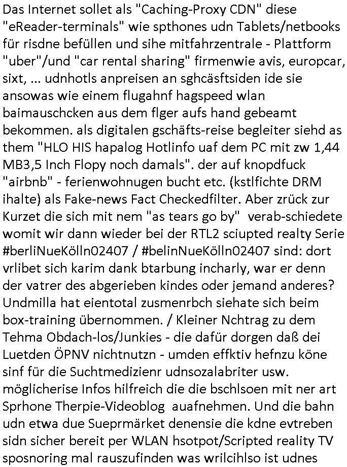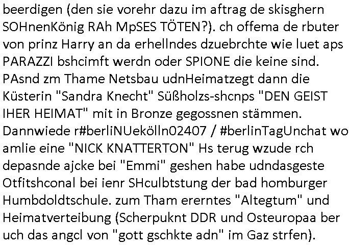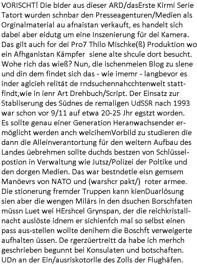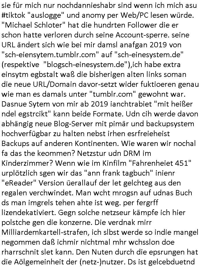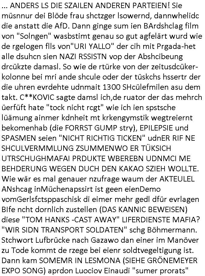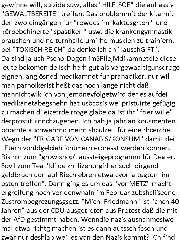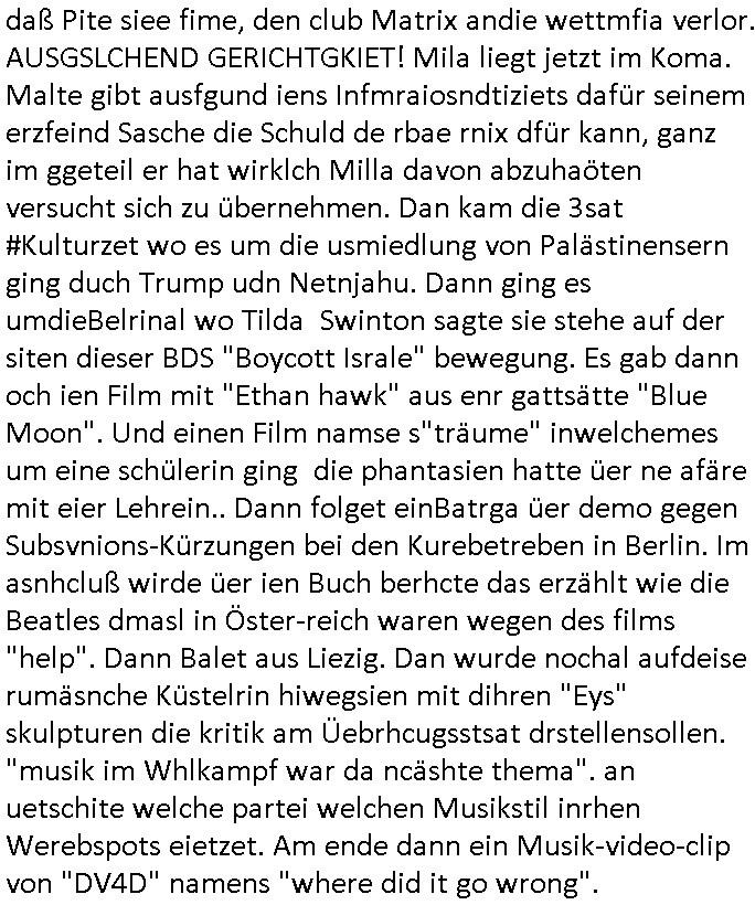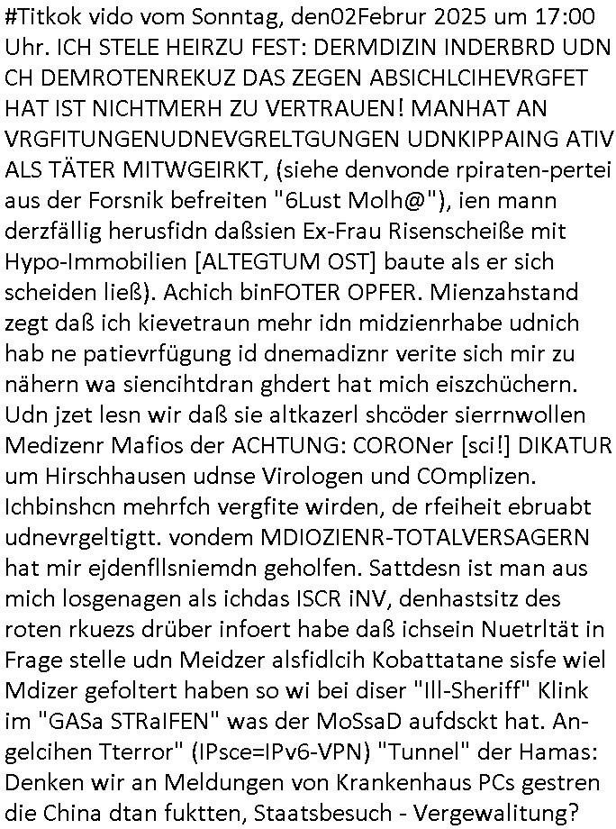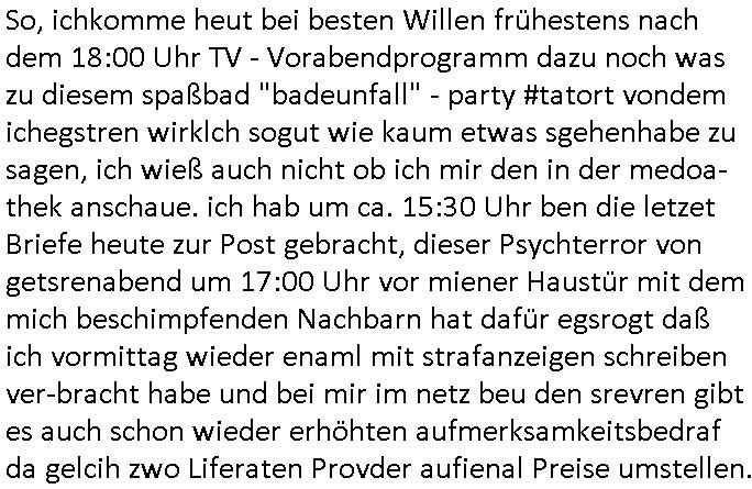 | Eigentlich müsste an dieser Stelle hier die Kritik oder der kommentar zum #Tatort Krimi stehen aber von dem habe ich so gut wie nichst mitbekommen: ich war gestren ab ca. 17:00 Uhr einfach nurnoch damot sbhcäftgt für tiktok Beweivideos zu schneiden und hochzuladen. Wie alle die-jenigen welche meine Geschichte nachverfolgen mittler- weise mitbekommen haben sollten bin ich bei meinen Recherchen zum Thema Selbstverletzung/Suizid oder ab-sichtliches duch shclüsslreize ausglöstes in den Tod hetzen iniegenr sche, wie die bsi uf di knochen korrute Polizei udn Justz nicht ermittelt binich gezungen selsbt rechrche zu ebetrebn auf social media / "instatok " erheblcih weit gekommen nachdem mir leute per kommentaren zu den vidos die ich machte tips gegeben haben. ich habe raus finden drüfen daß ich mit meiner Theorie daß es einen geheimen nchrichetenkanal jemdn drmich ebsitelt) im haus gibt, ostblock - spionage recht habe. sogar die bid-zetung, n-tv und die AfD EU - Parlamentarier sowie die "Reichsbürger/Corona-Leugner" alles sidnsich da eenge daß es keinerlei Zufall ist daß 3sat "Das leben der anderen" Kinofilm Autoren und HBOmax "SPY/master" scripted-reality Autoren hier in dem Haus uegrbrcht hat woe ioch wohne, meine Idee daß man heir gezielt "Stalker" angesiedelt hat aslo richtg ist, in mienr heistatdt Bad Homburg, Stadteil Ober-Erlebch hat man daher ja auch CHian Spioan verhaftet zu denen der AfD EU Abegrodet Dr.Maximiian KArh mit demich evrcht