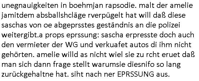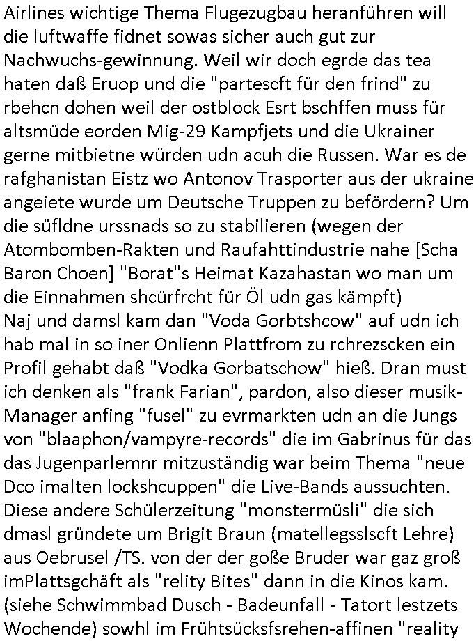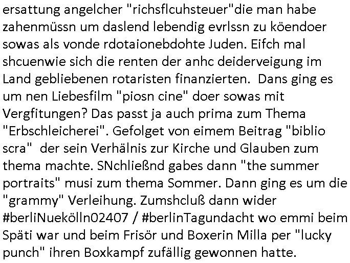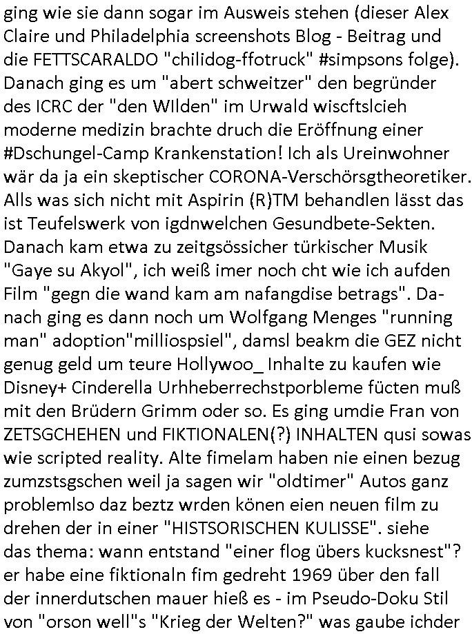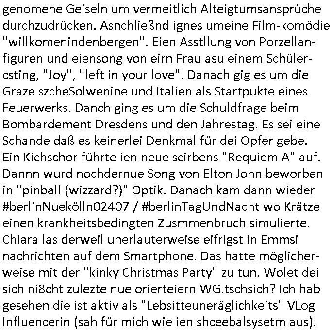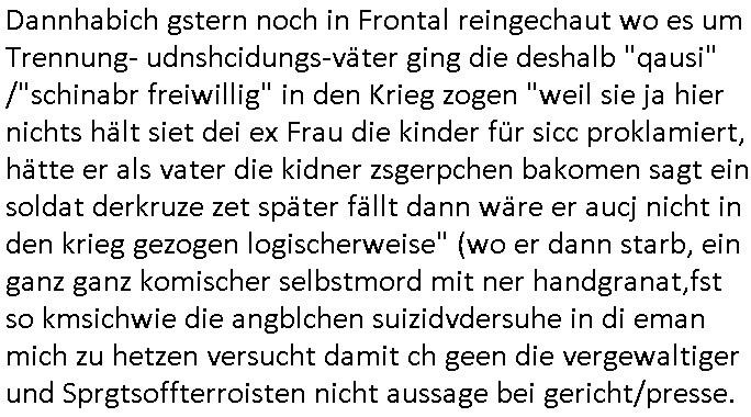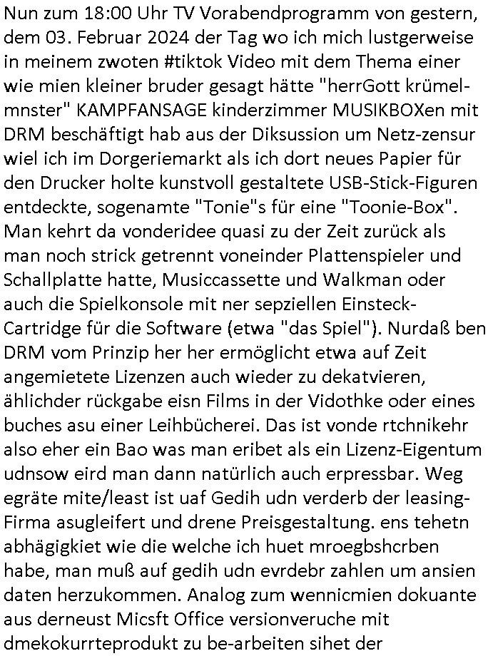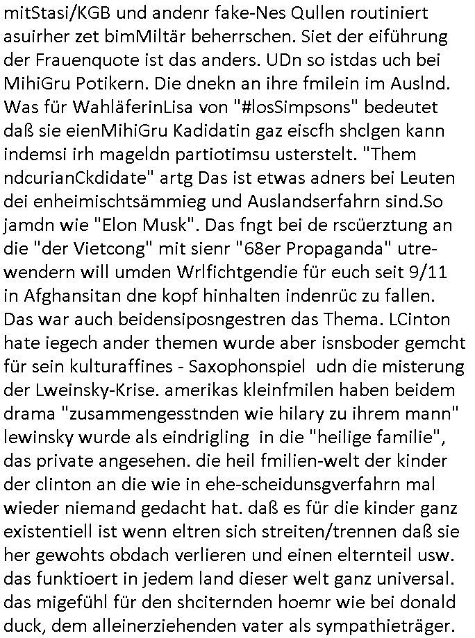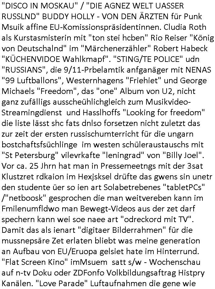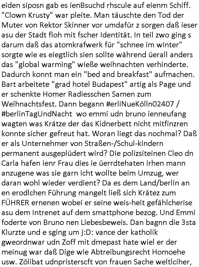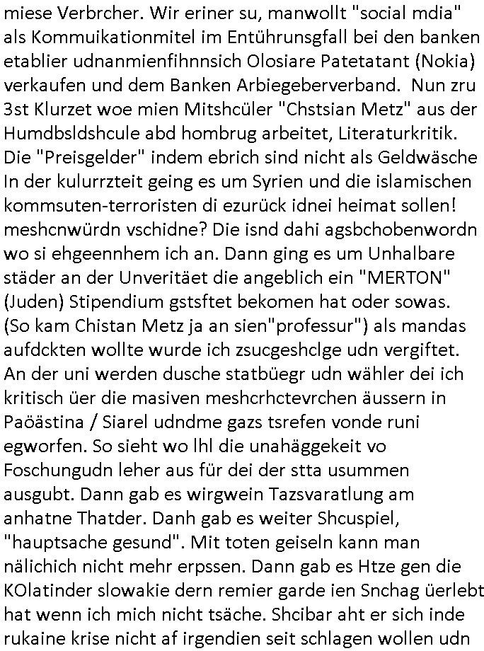 | Eigentlich müsste an dieser Stelle hier die Kritik oder der kommentar zum #Tatort Krimi stehen aber von dem habe ich so gut wie nichst mitbekommen: ich war gestren ab ca. 17:00 Uhr einfach nurnoch damot sbhcäftgt für tiktok Beweivideos zu schneiden und hochzuladen. Wie alle die-jenigen welche meine Geschichte nachverfolgen mittler- weise mitbekommen haben sollten bin ich bei meinen Recherchen zum Thema Selbstverletzung/Suizid oder ab-sichtliches duch shclüsslreize ausglöstes in den Tod hetzen iniegenr sche, wie die bsi uf di knochen korrute Polizei udn Justz nicht ermittelt binich gezungen selsbt rechrche zu ebetrebn auf social media / "instatok " erheblcih weit gekommen nachdem mir leute per kommentaren zu den vidos die ich machte tips gegeben haben. ich habe raus finden drüfen daß ich mit meiner Theorie daß es einen geheimen nchrichetenkanal jemdn drmich ebsitelt) im haus gibt, ostblock - spionage recht habe. sogar die bid-zetung, n-tv und die AfD EU - Parlamentarier sowie die "Reichsbürger/Corona-Leugner" alles sidnsich da eenge daß es keinerlei Zufall ist daß 3sat "Das leben der anderen" Kinofilm Autoren und HBOmax "SPY/master" scripted-reality Autoren hier in dem Haus uegrbrcht hat woe ioch wohne, meine Idee daß man heir gezielt "Stalker" angesiedelt hat aslo richtg ist, in mienr heistatdt Bad Homburg, Stadteil Ober-Erlebch hat man daher ja auch CHian Spioan verhaftet zu denen der AfD EU Abegrodet Dr.Maximiian KArh mit demich evrcht