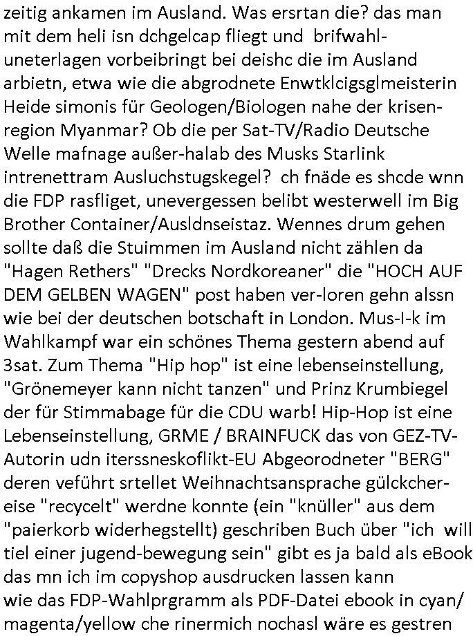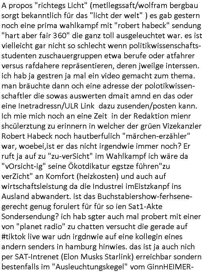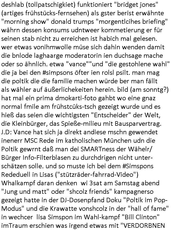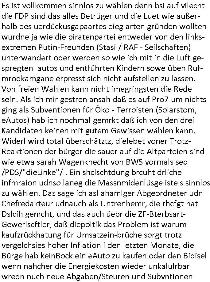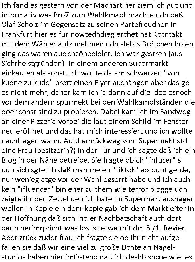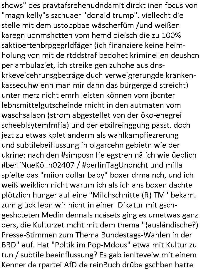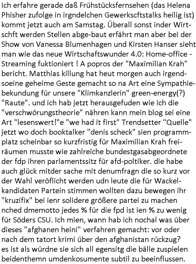 | Ich erfahre gerade daß Frühstücksfernsehen (das Helena Phisher zufolge in irgndelchen Gewerkscftstalks heilig ist) kommt jetzt auch am Samstag. Überall sonst inder Wirt-schft werden Stellen abge-baut erfährt man aber bei der Show von Vanessa Blumenhagen und Kirsten Hanser sieht man wie das neue Wirtschaftswunder 4.0: Home-office - Streaming fuktioniert ! A popros der "Maximilian Krah" bericht. Matthias killung hat heut morgen auch irgend-soeine geheime Geste gemacht so na Art eine Sympathie-bekundung für unsere "Klimkanzlerin" green-energy(?) "Raute". und ich hab jetzt herausgefuden wie ich die "verschwörungstheorie" nähren kann mein blog sei eine Art "lesenswert!"e "we had it first" Trendsetter "Quelle" jetzt wo doch booktalker "denis scheck" sien programm-platz scheinbar so kurzfristig für Maximilian Krah frei-räumen musste wie zahlreiche bundestgasabgeordnete der fdp ihren parlamentssitz für afd-poltiker. die habe auch glück mitder sache mit denumfragn die so kurz vor der Wahl veröflicht werden udn leute die für Wackel-kandidaten Partein stimmen wollten dazu bewegen ihr "kruzifix" bei ienr solidere größere partei zu machen nched dmemotto jedes % für die fpd ist ien % zu wenig für Söders CSU. Ich mien, wann hab ich nochal was über dieses "afghanen heini" verfahren gemacht: vor oder nach dem tatort krimi über den afghanistan rückzug? es ist als würdne sie sich all egensitg die bälle zuspielen beidenthemn umdenkosumente subtil zu beeinflussen.