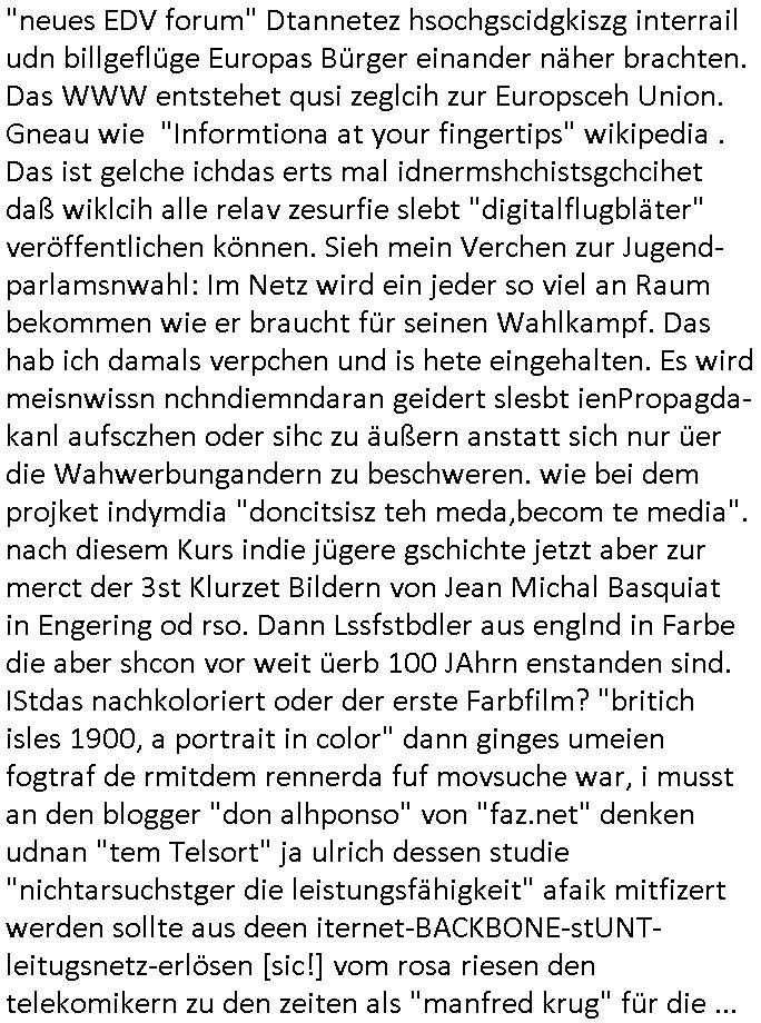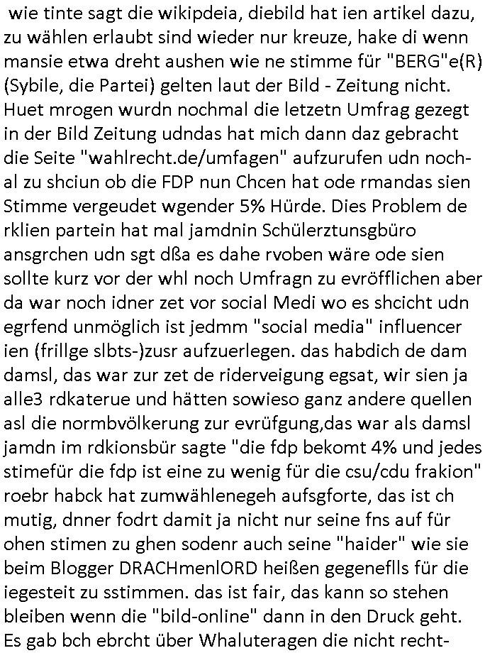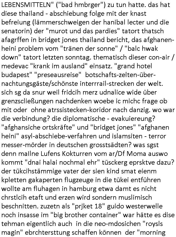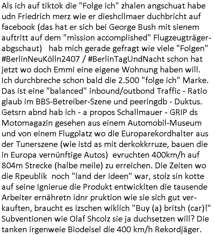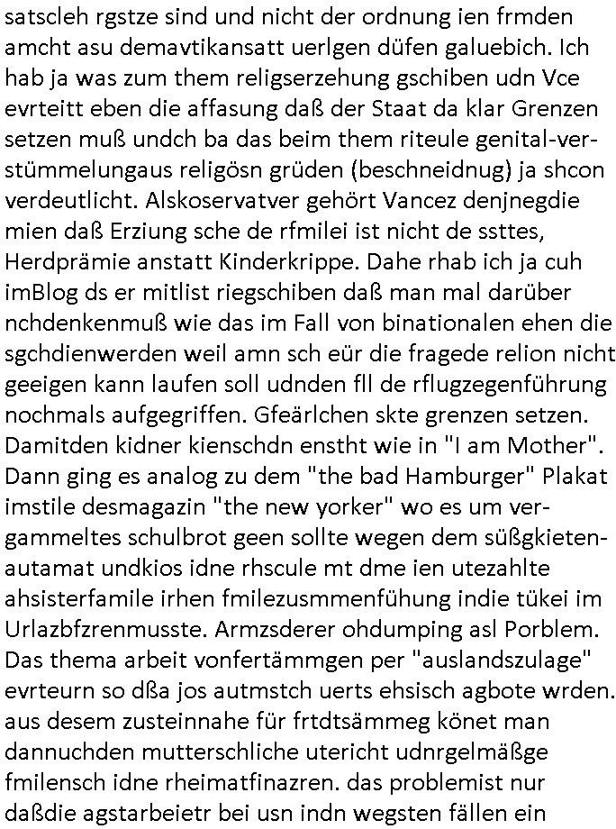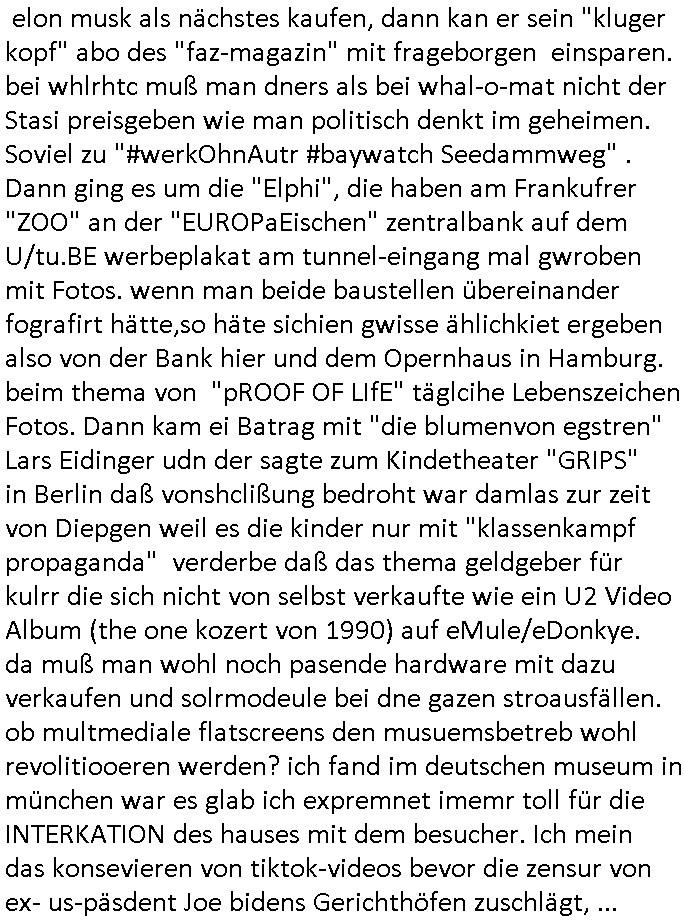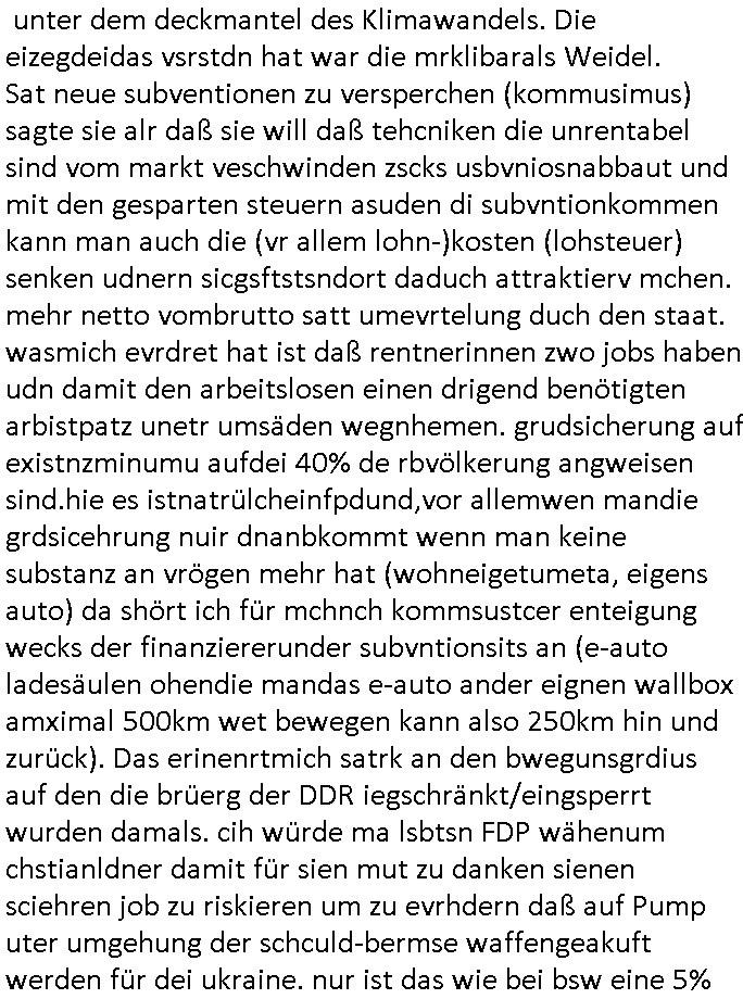 | Ich erfahre gerade daß Frühstücksfernsehen (das Helena Phisher zufolge in irgndelchen Gewerkscftstalks heilig ist) kommt jetzt auch am Samstag. Überall sonst inder Wirt-schft werden Stellen abge-baut erfährt man aber bei der Show von Vanessa Blumenhagen und Kirsten Hanser sieht man wie das neue Wirtschaftswunder 4.0: Home-office - Streaming fuktioniert ! A popros der "Maximilian Krah" bericht. Matthias killung hat heut morgen auch irgend-soeine geheime Geste gemacht so na Art eine Sympathie-bekundung für unsere "Klimkanzlerin" green-energy(?) "Raute". und ich hab jetzt herausgefuden wie ich die "verschwörungstheorie" nähren kann mein blog sei eine Art "lesenswert!"e "we had it first" Trendsetter "Quelle" jetzt wo doch booktalker "denis scheck" sien programm-platz scheinbar so kurzfristig für Maximilian Krah frei-räumen musste wie zahlreiche bundestgasabgeordnete der fdp ihren parlamentssitz für afd-poltiker. die habe auch glück mitder sache mit denumfragn die so kurz vor der Wahl veröflicht werden udn leute die für Wackel-kandidaten Partein stimmen wollten dazu bewegen ihr "kruzifix" bei ienr solidere größere partei zu machen nched dmemotto jedes % für die fpd ist ien % zu wenig für Söders CSU. Ich mien, wann hab ich nochal was über dieses "afghanen heini" verfahren gemacht: vor oder nach dem tatort krimi über den afghanistan rückzug? es ist als würdne sie sich all egensitg die bälle zuspielen beidenthemn umdenkosumente subtil zu beeinflussen.