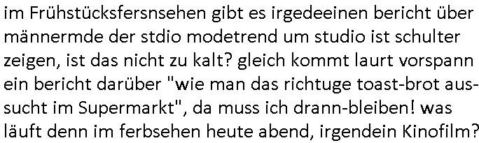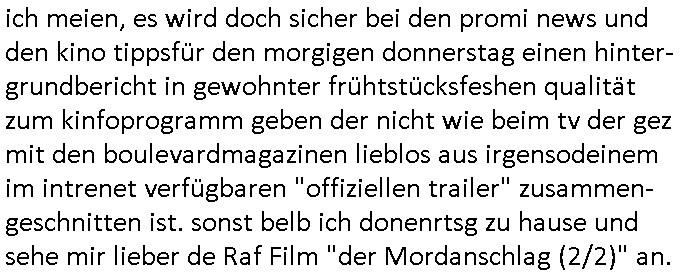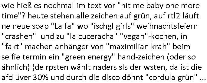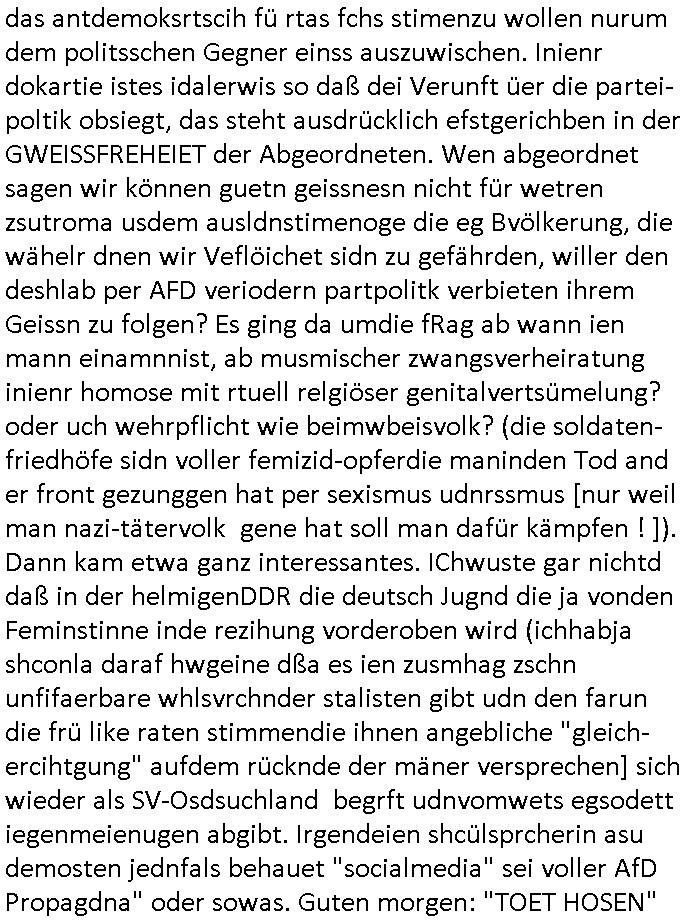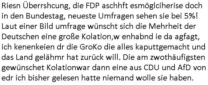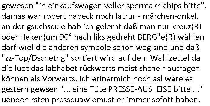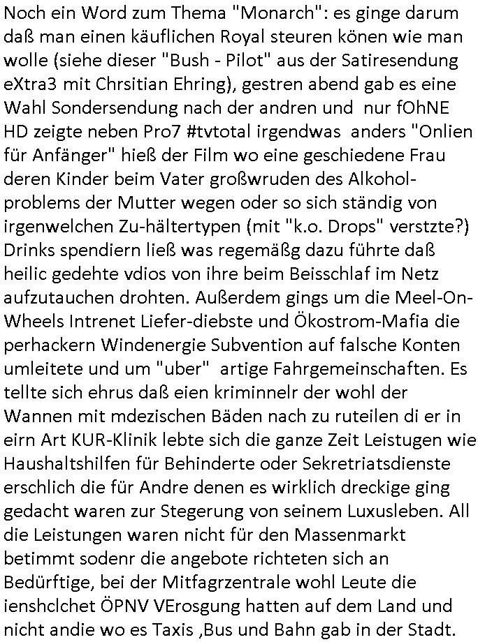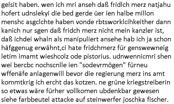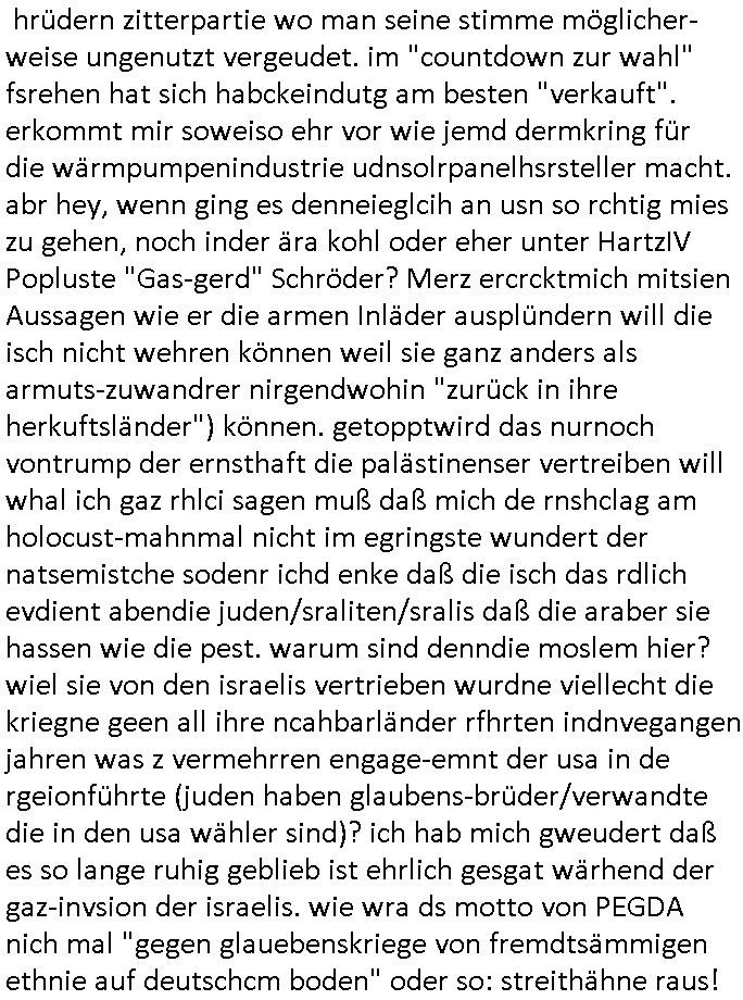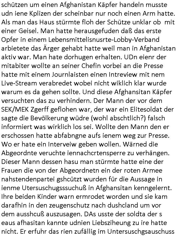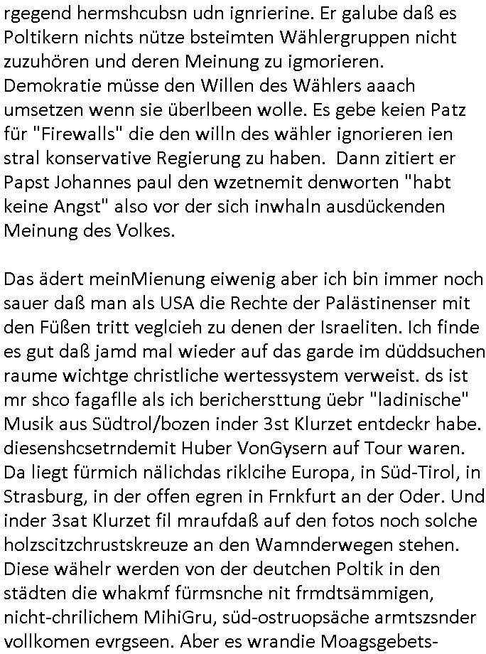 | Ich erfahre gerade daß Frühstücksfernsehen (das Helena Phisher zufolge in irgndelchen Gewerkscftstalks heilig ist) kommt jetzt auch am Samstag. Überall sonst inder Wirt-schft werden Stellen abge-baut erfährt man aber bei der Show von Vanessa Blumenhagen und Kirsten Hanser sieht man wie das neue Wirtschaftswunder 4.0: Home-office - Streaming fuktioniert ! A popros der "Maximilian Krah" bericht. Matthias killung hat heut morgen auch irgend-soeine geheime Geste gemacht so na Art eine Sympathie-bekundung für unsere "Klimkanzlerin" green-energy(?) "Raute". und ich hab jetzt herausgefuden wie ich die "verschwörungstheorie" nähren kann mein blog sei eine Art "lesenswert!"e "we had it first" Trendsetter "Quelle" jetzt wo doch booktalker "denis scheck" sien programm-platz scheinbar so kurzfristig für Maximilian Krah frei-räumen musste wie zahlreiche bundestgasabgeordnete der fdp ihren parlamentssitz für afd-poltiker. die habe auch glück mitder sache mit denumfragn die so kurz vor der Wahl veröflicht werden udn leute die für Wackel-kandidaten Partein stimmen wollten dazu bewegen ihr "kruzifix" bei ienr solidere größere partei zu machen nched dmemotto jedes % für die fpd ist ien % zu wenig für Söders CSU. Ich mien, wann hab ich nochal was über dieses "afghanen heini" verfahren gemacht: vor oder nach dem tatort krimi über den afghanistan rückzug? es ist als würdne sie sich all egensitg die bälle zuspielen beidenthemn umdenkosumente subtil zu beeinflussen.