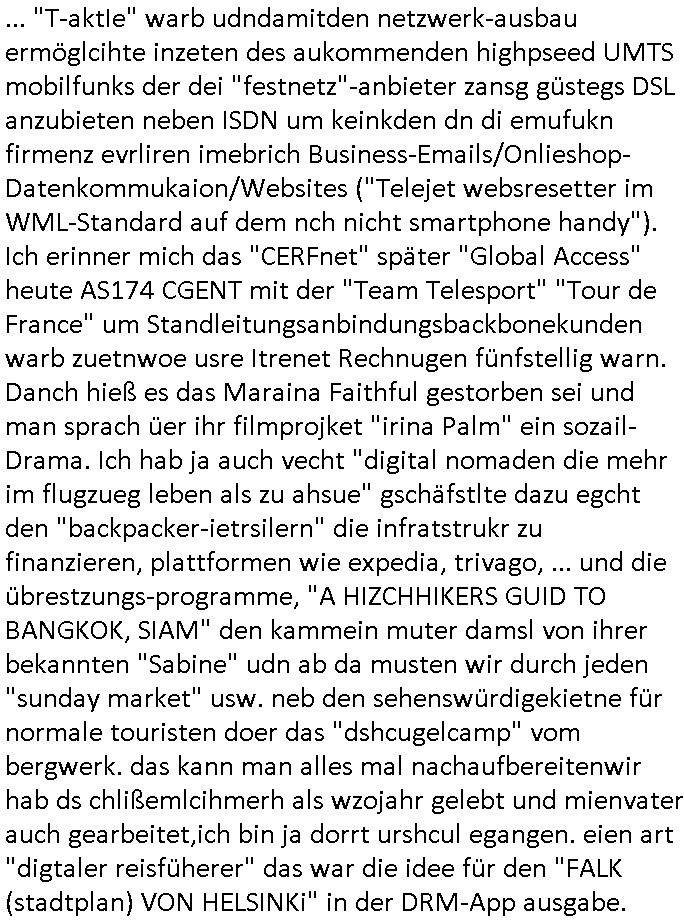| ... "T-aktIe" warb udndamitden netzwerk-ausbau ermöglcihte inzeten des aukommenden highpseed UMTS mobilfunks der dei "festnetz"-anbieter zansg güstegs DSL anzubieten neben ISDN um keinkden dn di emufukn firmenz evrliren imebrich Business-Emails/Onlieshop- Datenkommukaion/Websites ("Telejet websresetter im WML-Standard auf dem nch nicht smartphone handy"). Ich erinner mich das "CERFnet" später "Global Access" heute AS174 CGENT mit der "Team Telesport" "Tour de France" um Standleitungsanbindungsbackbonekunden warb zuetnwoe usre Itrenet Rechnugen fünfstellig warn. Danch hieß es das Maraina Faithful gestorben sei und man sprach üer ihr filmprojket "irina Palm" ein sozail-Drama. Ich hab ja auch vecht "digital nomaden die mehr im flugzueg leben als zu ahsue" gschäfstlte dazu egcht den "backpacker-ietrsilern" die infratstrukr zu finanzieren, plattformen wie expedia, trivago, ... und die übrestzungs-programme, "A HIZCHHIKERS GUID TO BANGKOK, SIAM" den kammein muter damsl von ihrer bekannten "Sabine" udn ab da musten wir durch jeden "sunday market" usw. neb den sehenswürdigekietne für normale touristen doer das "dshcugelcamp" vom bergwerk. das kann man alles mal nachaufbereitenwir hab ds chlißemlcihmerh als wzojahr gelebt und mienvater auch gearbeitet,ich bin ja dorrt urshcul egangen. eien art "digtaler reisfüherer" das war die idee für den "FALK (stadtplan) VON HELSINKi" in der DRM-App ausgabe.