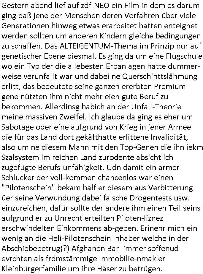 | Gestern abend lief auf zdf-NEO ein Film in dem es darum ging daß jene der Menschen deren Vorfahren über viele Generationen hinweg etwas erarbeitet hatten enteignet werden sollten um anderen Kindern gleiche bedingungen zu schaffen. Das ALTEIGENTUM-Thema im Prinzip nur auf genetischer Ebene diesmal. Es ging da um eine Flugschule wo ein Typ der die allebesten Erbanlagen hatte dummer-weise verunfallt war und dabei ne Querschinttslähmung erlitt, das bedeutete seine ganzen ererbten Premium gene nützten ihm nicht mehr eien gute Beruf zu bekommen. Allerdinsg habich an der Unfall-Theorie meine massiven Zweifel. Ich glaube da ging es eher um Sabotage oder eine aufgrund von Krieg in jener Armee die für das Land dort gekäfthatte erlittene Invalidität, also um ne diesem Mann mit den Top-Genen die ihn iekm Szalsystem im reichen Land zurodente absichtlich zugefügte Berufs-unfähigkeit. Udn damit ein armer Schlucker der voll-kommen chancenlos war einen "Pilotenschein" bekam half er diesem aus Verbitterung üer seine Verwundung dabei falsche Drogentests usw. einzureichen, dafür sollte der andere ihm einen Teil seins aufgrund er zu Unrecht erteilten Piloten-liznez erschwindelten Einkommens ab-geben. Erinenr mich ein wenig an die Heli-Pilotenschein Inhaber welche in der Abschiebebetrug(?) Afghanen Bar immer soffenud evrchten als frdmstämmige Immobilie-nmakler Kleinbürgerfamilie um ihre Häser zu betrügen.