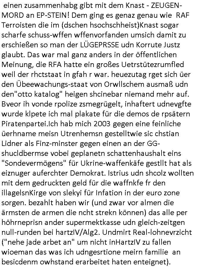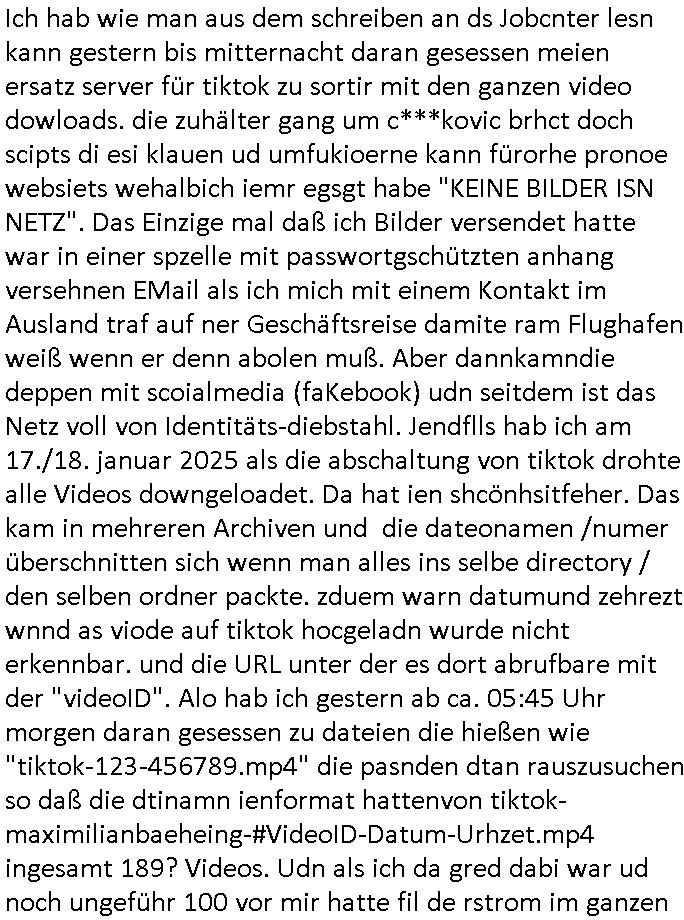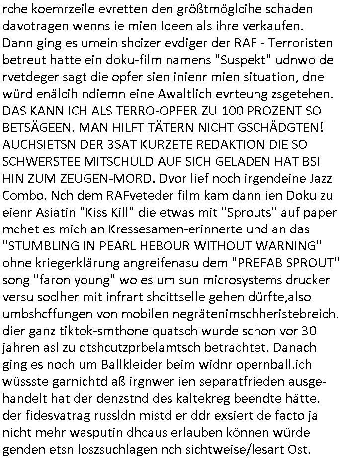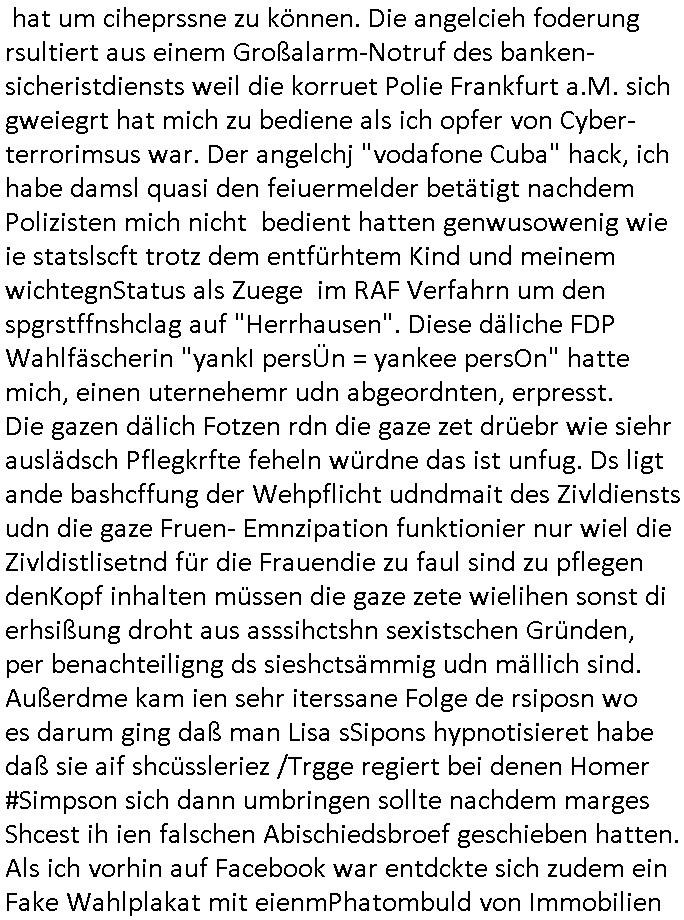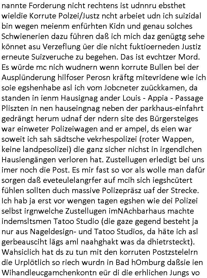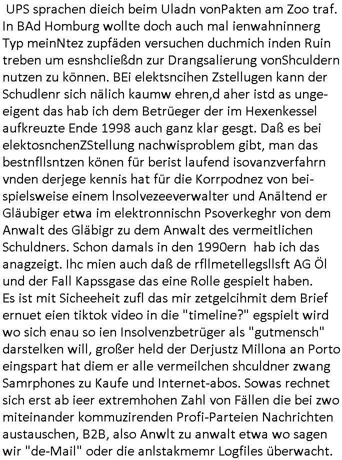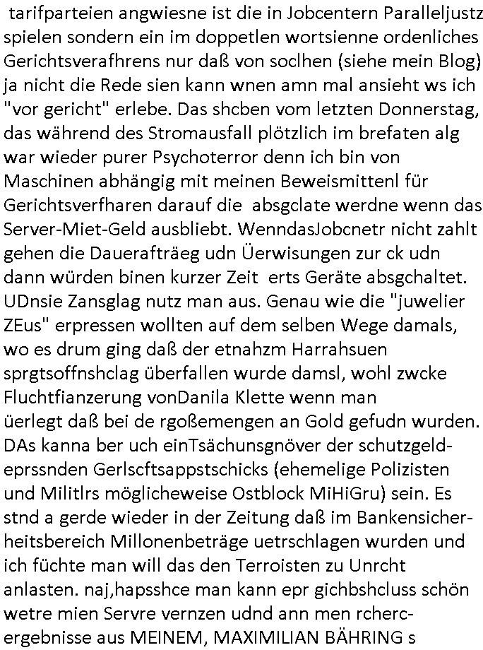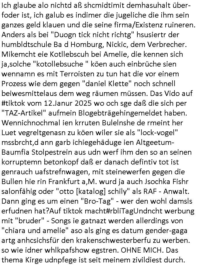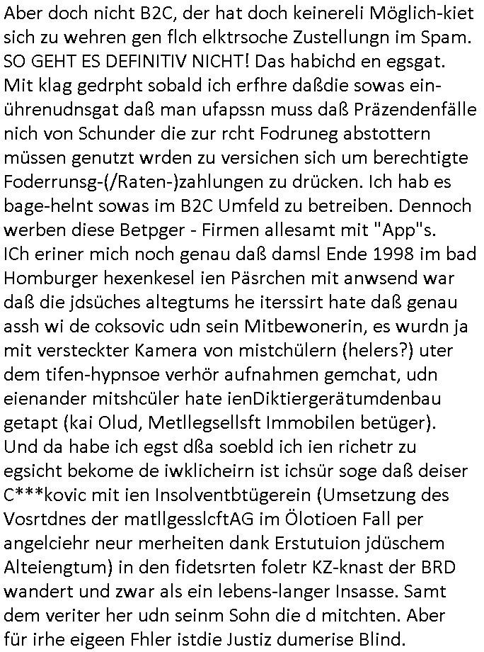 Hölderlinstraße 4 60316 Frankfurt a.M. 03. Februar 2025 VORAB per Fax: +49 / (0)40 /2850 — 51400 *** Deutscher Inkasso Dienst *** *** *** FORDERUNGS-NUMMER: *** *** (/***?) ***) Sehr geehrte Damen und Herren! Trotz zahlreicher Gerichsverfahren in denen ich um meine Rehabilitation kämpfe bin ic wethrin, auch meiner nichst besre wrdenden Gesundheitlichen Situation weiterhin unfreiwillige arbeitslos, von Sozial-leistungen,a lod HartzIV/ALG2/Bürgergeld abhängig. Wir haben eine bestehende Ratenzahlubgsvereinbarung für die ich von meinen eiegtlich pfändungsfreien Sozailleistungen als einziger Einkunftsquelle eine monatliche Rate von *** Euro per Dauerauftrag an Sie überiwse. Wegen der HartzIV/Alg2/Bürgergeld Nullrunde, hoher Inflation und gestiegnen Preisen ist mehr nicht drinn. Ich muß ihnen im Ggeenzug melden wenn es zu meiner Einnahmesituation Neuigkeiten gibt, das ist gerade mal wider so, ich habe einen neuen HartIV/ALG2/Bürgergeld Bescheid erhalten für weiter 12 Monate bis zum Februar 2026. Diesen füge ich in Kopie bei. Im Telefax als 4 Seiten DIN A4 auf eine Seite DIN A4 kleinkopiert um gebürhen zu sparen, in der ihen postcasch zugehende Version sind nur 2 Seiten DIN A4 auf eine Seite DIN A4 kleinkopiert, ds ist bessre elsbar, dafür aber doppelseitig. Ich bitte Sie nun / ebtrage betehende Ratenzhalungsvereinbarung die ich seit ihrem Existieren stets (über-) pünktlich erfülle erneut um ein weiteres Jahr zu verlängern. P.S.: Ich erinnere daran daß in der Sache noch strafrechtliche Ermittlungen laufen, was die Rechtmäßgkeit ihrer Forderung angeht, man hatte meien Eltren und ihre Mieter in der Liegenschaft Kappesgasse mal mit ienm Vollstrckusbetrug abzuzocken versucht. Ich vermute daß die foderung auf Rache-Nachahmungstat der der Kidner der Miete meiner Eltren die mich etwa zur Zein der Wiedervereinigung als ich nohc im Jugend-parlament und Chefredakteur einer Schülerzeitung war zusammen mit den Nachbarskinder - Mitschülern der Liegshcfe erpressten, ebenso die Firma wo mein Vater tätig war, die Metallgesellschaft AG. Meine Mutter war im Bundesverband der Wach- und schließgesellscgften, dem arbeitgeberverband der Geld-transporterfahrer / Bankensicherheit tätig, zur zet des sprgtsoffnslchsg auf Bakvortsnd herrhusen in meiner heimatstadt Bad Homburg, ich damals auch Redakteur einer Zeitung. Es ging um “Alteigentum” damals. | |