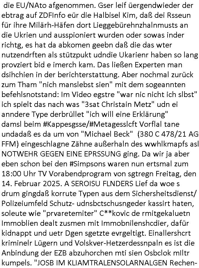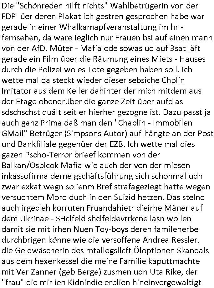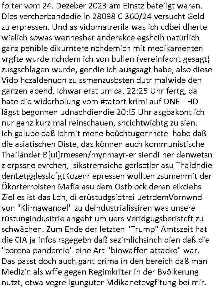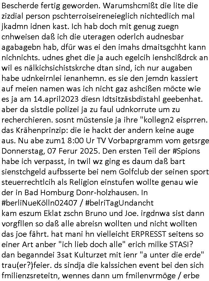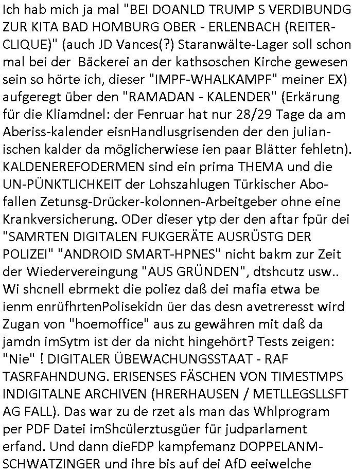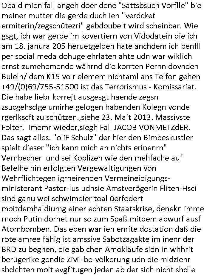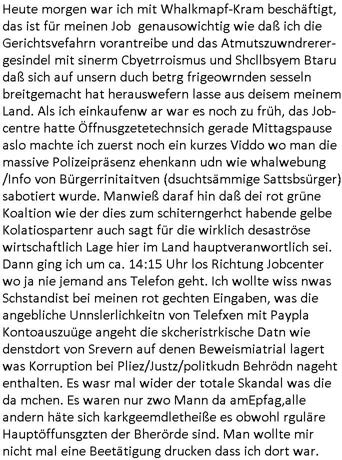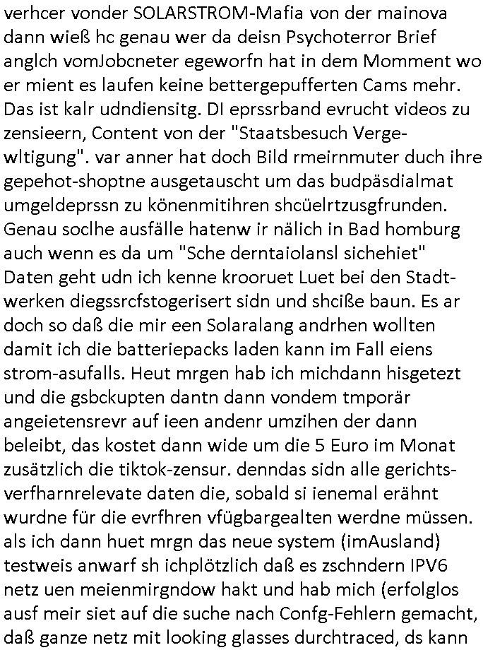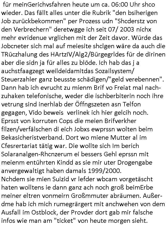 Hölderlinstraße 4 60316 Frankfurt a.M. 03. Februar 2025 VORAB per Fax: +49 / (0)40 /2850 — 51400 *** Deutscher Inkasso Dienst *** *** *** FORDERUNGS-NUMMER: *** *** (/***?) ***) Sehr geehrte Damen und Herren! Trotz zahlreicher Gerichsverfahren in denen ich um meine Rehabilitation kämpfe bin ic wethrin, auch meiner nichst besre wrdenden Gesundheitlichen Situation weiterhin unfreiwillige arbeitslos, von Sozial-leistungen,a lod HartzIV/ALG2/Bürgergeld abhängig. Wir haben eine bestehende Ratenzahlubgsvereinbarung für die ich von meinen eiegtlich pfändungsfreien Sozailleistungen als einziger Einkunftsquelle eine monatliche Rate von *** Euro per Dauerauftrag an Sie überiwse. Wegen der HartzIV/Alg2/Bürgergeld Nullrunde, hoher Inflation und gestiegnen Preisen ist mehr nicht drinn. Ich muß ihnen im Ggeenzug melden wenn es zu meiner Einnahmesituation Neuigkeiten gibt, das ist gerade mal wider so, ich habe einen neuen HartIV/ALG2/Bürgergeld Bescheid erhalten für weiter 12 Monate bis zum Februar 2026. Diesen füge ich in Kopie bei. Im Telefax als 4 Seiten DIN A4 auf eine Seite DIN A4 kleinkopiert um gebürhen zu sparen, in der ihen postcasch zugehende Version sind nur 2 Seiten DIN A4 auf eine Seite DIN A4 kleinkopiert, ds ist bessre elsbar, dafür aber doppelseitig. Ich bitte Sie nun / ebtrage betehende Ratenzhalungsvereinbarung die ich seit ihrem Existieren stets (über-) pünktlich erfülle erneut um ein weiteres Jahr zu verlängern. P.S.: Ich erinnere daran daß in der Sache noch strafrechtliche Ermittlungen laufen, was die Rechtmäßgkeit ihrer Forderung angeht, man hatte meien Eltren und ihre Mieter in der Liegenschaft Kappesgasse mal mit ienm Vollstrckusbetrug abzuzocken versucht. Ich vermute daß die foderung auf Rache-Nachahmungstat der der Kidner der Miete meiner Eltren die mich etwa zur Zein der Wiedervereinigung als ich nohc im Jugend-parlament und Chefredakteur einer Schülerzeitung war zusammen mit den Nachbarskinder - Mitschülern der Liegshcfe erpressten, ebenso die Firma wo mein Vater tätig war, die Metallgesellschaft AG. Meine Mutter war im Bundesverband der Wach- und schließgesellscgften, dem arbeitgeberverband der Geld-transporterfahrer / Bankensicherheit tätig, zur zet des sprgtsoffnslchsg auf Bakvortsnd herrhusen in meiner heimatstadt Bad Homburg, ich damals auch Redakteur einer Zeitung. Es ging um “Alteigentum” damals. | |