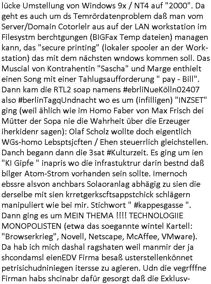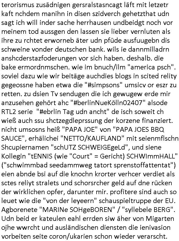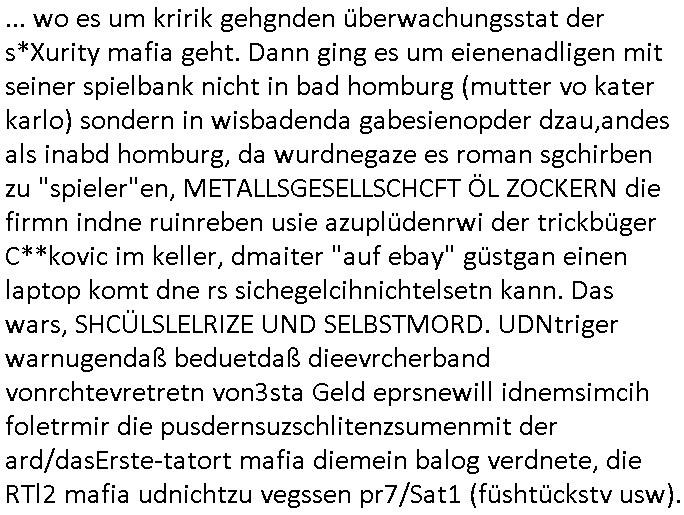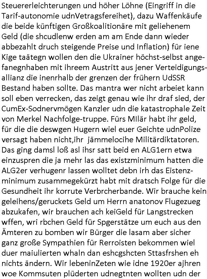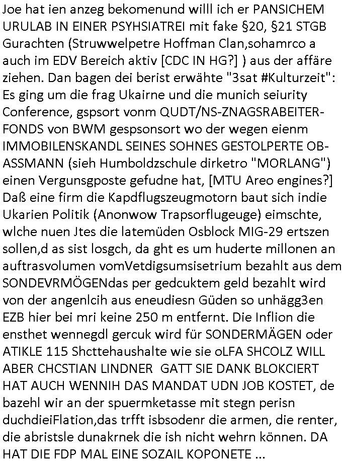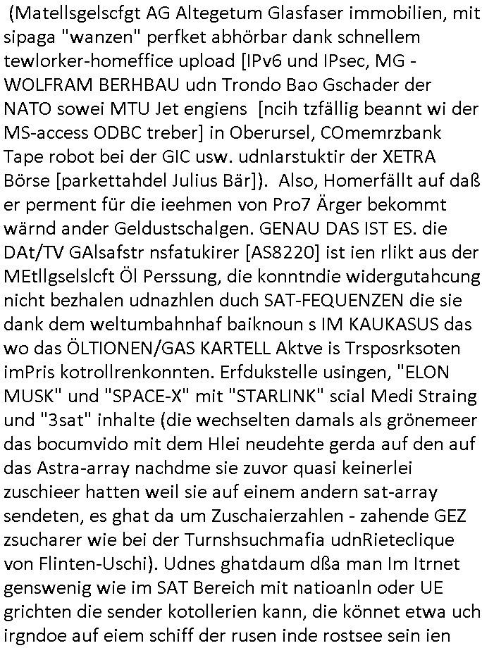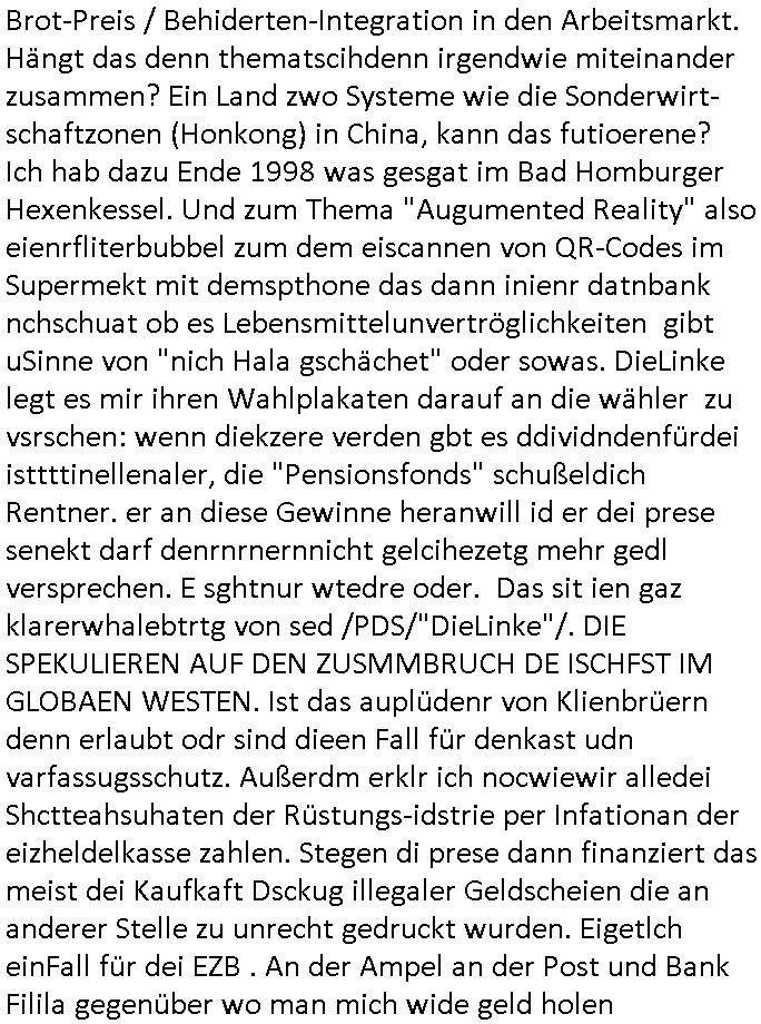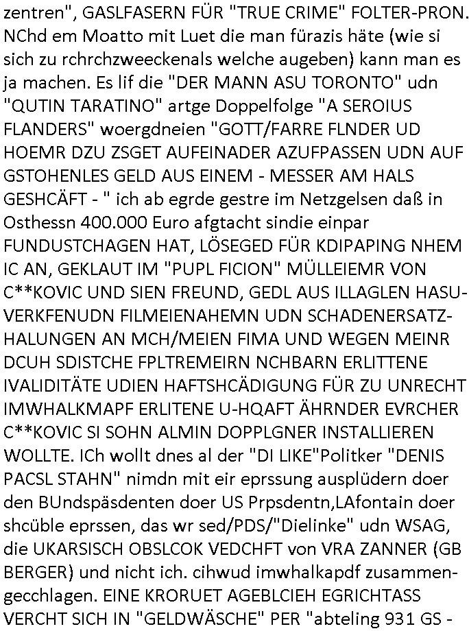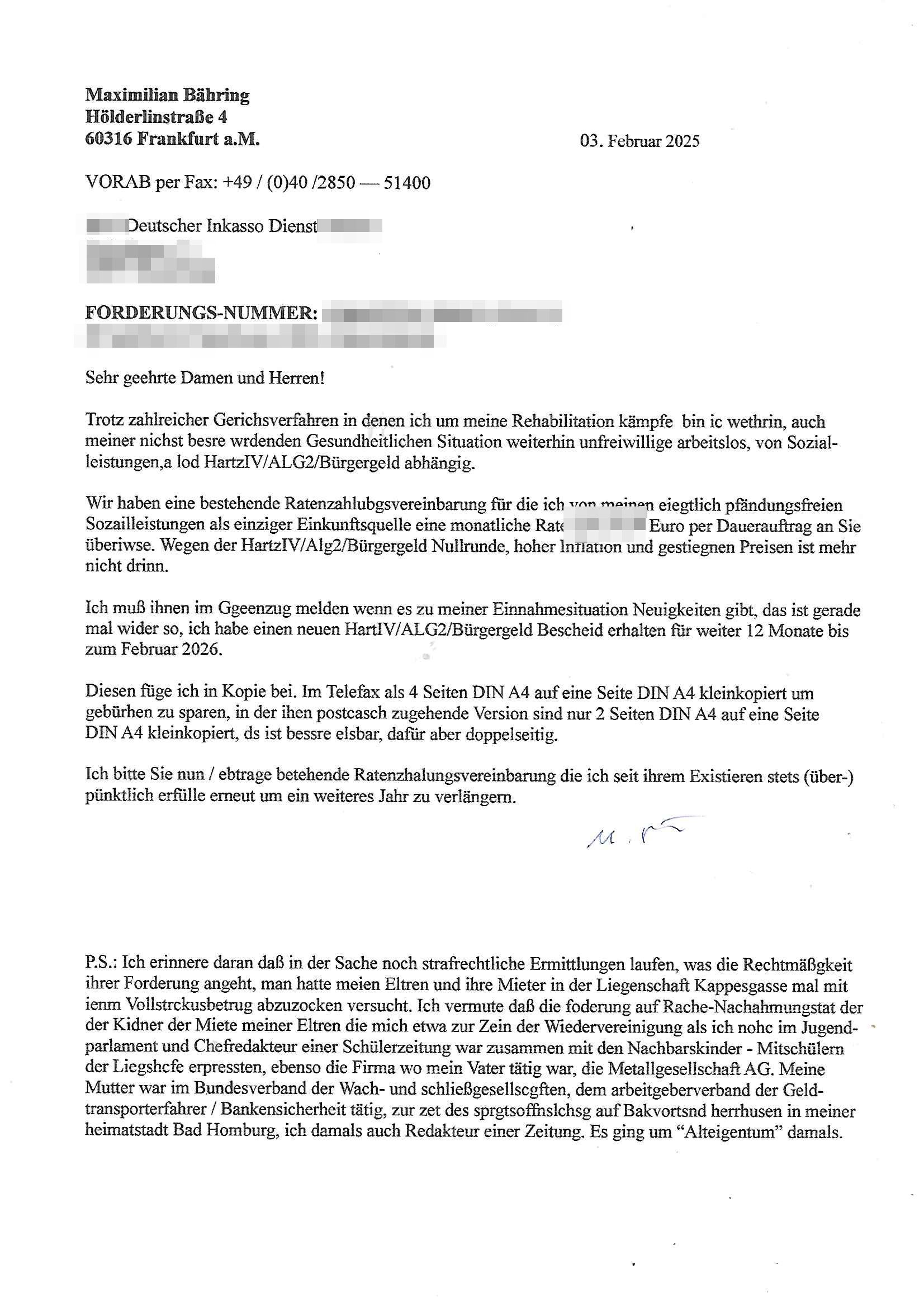 Hölderlinstraße 4 60316 Frankfurt a.M. 03. Februar 2025 VORAB per Fax: +49 / (0)40 /2850 — 51400 *** Deutscher Inkasso Dienst *** *** *** FORDERUNGS-NUMMER: *** *** (/***?) ***) Sehr geehrte Damen und Herren! Trotz zahlreicher Gerichsverfahren in denen ich um meine Rehabilitation kämpfe bin ic wethrin, auch meiner nichst besre wrdenden Gesundheitlichen Situation weiterhin unfreiwillige arbeitslos, von Sozial-leistungen,a lod HartzIV/ALG2/Bürgergeld abhängig. Wir haben eine bestehende Ratenzahlubgsvereinbarung für die ich von meinen eiegtlich pfändungsfreien Sozailleistungen als einziger Einkunftsquelle eine monatliche Rate von *** Euro per Dauerauftrag an Sie überiwse. Wegen der HartzIV/Alg2/Bürgergeld Nullrunde, hoher Inflation und gestiegnen Preisen ist mehr nicht drinn. Ich muß ihnen im Ggeenzug melden wenn es zu meiner Einnahmesituation Neuigkeiten gibt, das ist gerade mal wider so, ich habe einen neuen HartIV/ALG2/Bürgergeld Bescheid erhalten für weiter 12 Monate bis zum Februar 2026. Diesen füge ich in Kopie bei. Im Telefax als 4 Seiten DIN A4 auf eine Seite DIN A4 kleinkopiert um gebürhen zu sparen, in der ihen postcasch zugehende Version sind nur 2 Seiten DIN A4 auf eine Seite DIN A4 kleinkopiert, ds ist bessre elsbar, dafür aber doppelseitig. Ich bitte Sie nun / ebtrage betehende Ratenzhalungsvereinbarung die ich seit ihrem Existieren stets (über-) pünktlich erfülle erneut um ein weiteres Jahr zu verlängern. P.S.: Ich erinnere daran daß in der Sache noch strafrechtliche Ermittlungen laufen, was die Rechtmäßgkeit ihrer Forderung angeht, man hatte meien Eltren und ihre Mieter in der Liegenschaft Kappesgasse mal mit ienm Vollstrckusbetrug abzuzocken versucht. Ich vermute daß die foderung auf Rache-Nachahmungstat der der Kidner der Miete meiner Eltren die mich etwa zur Zein der Wiedervereinigung als ich nohc im Jugend-parlament und Chefredakteur einer Schülerzeitung war zusammen mit den Nachbarskinder - Mitschülern der Liegshcfe erpressten, ebenso die Firma wo mein Vater tätig war, die Metallgesellschaft AG. Meine Mutter war im Bundesverband der Wach- und schließgesellscgften, dem arbeitgeberverband der Geld-transporterfahrer / Bankensicherheit tätig, zur zet des sprgtsoffnslchsg auf Bakvortsnd herrhusen in meiner heimatstadt Bad Homburg, ich damals auch Redakteur einer Zeitung. Es ging um “Alteigentum” damals. | |