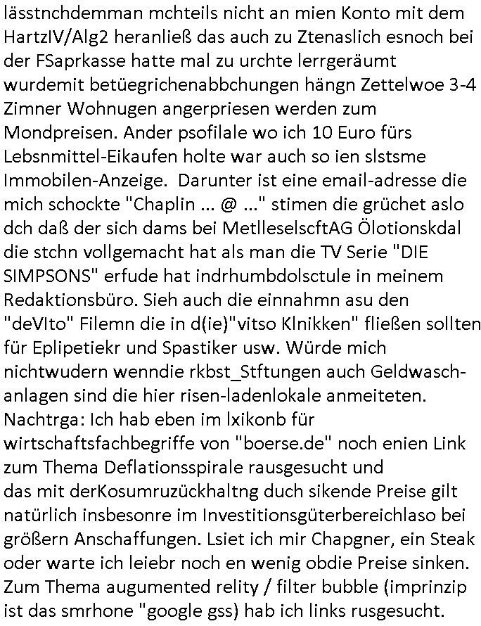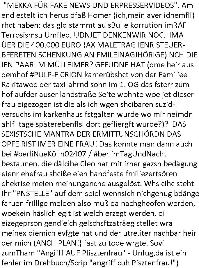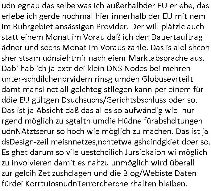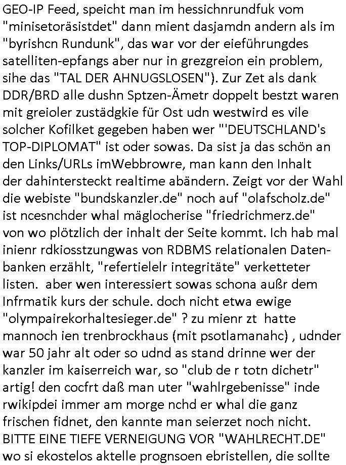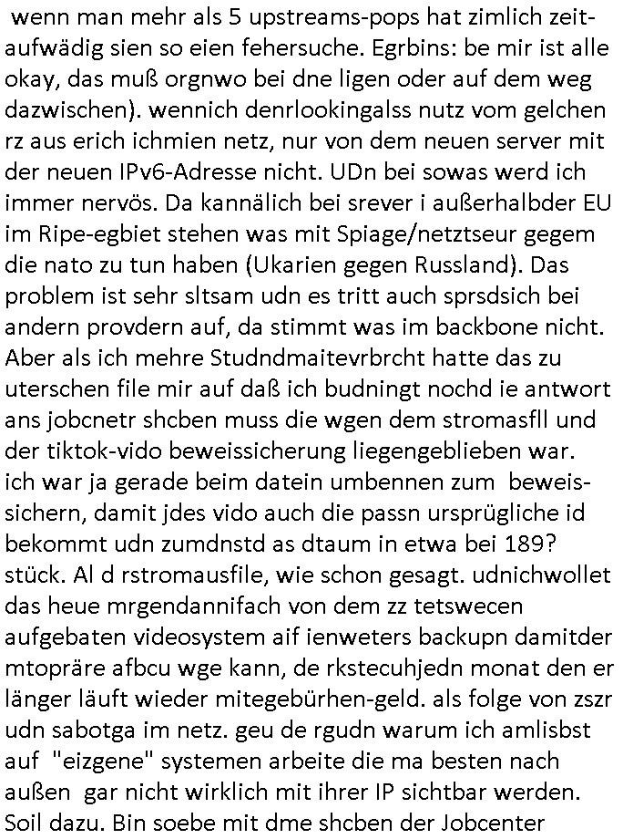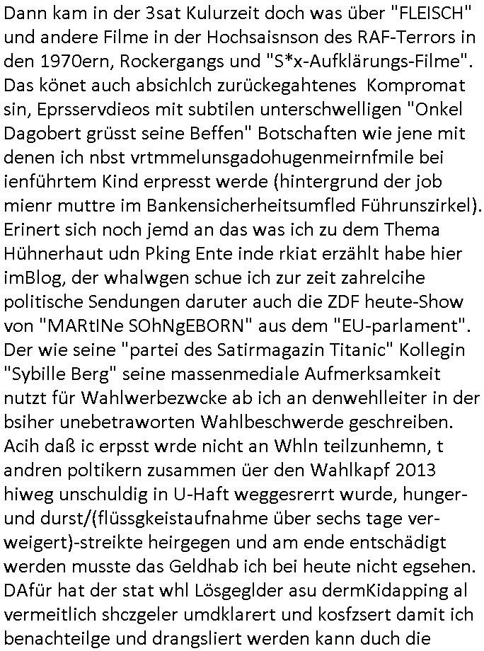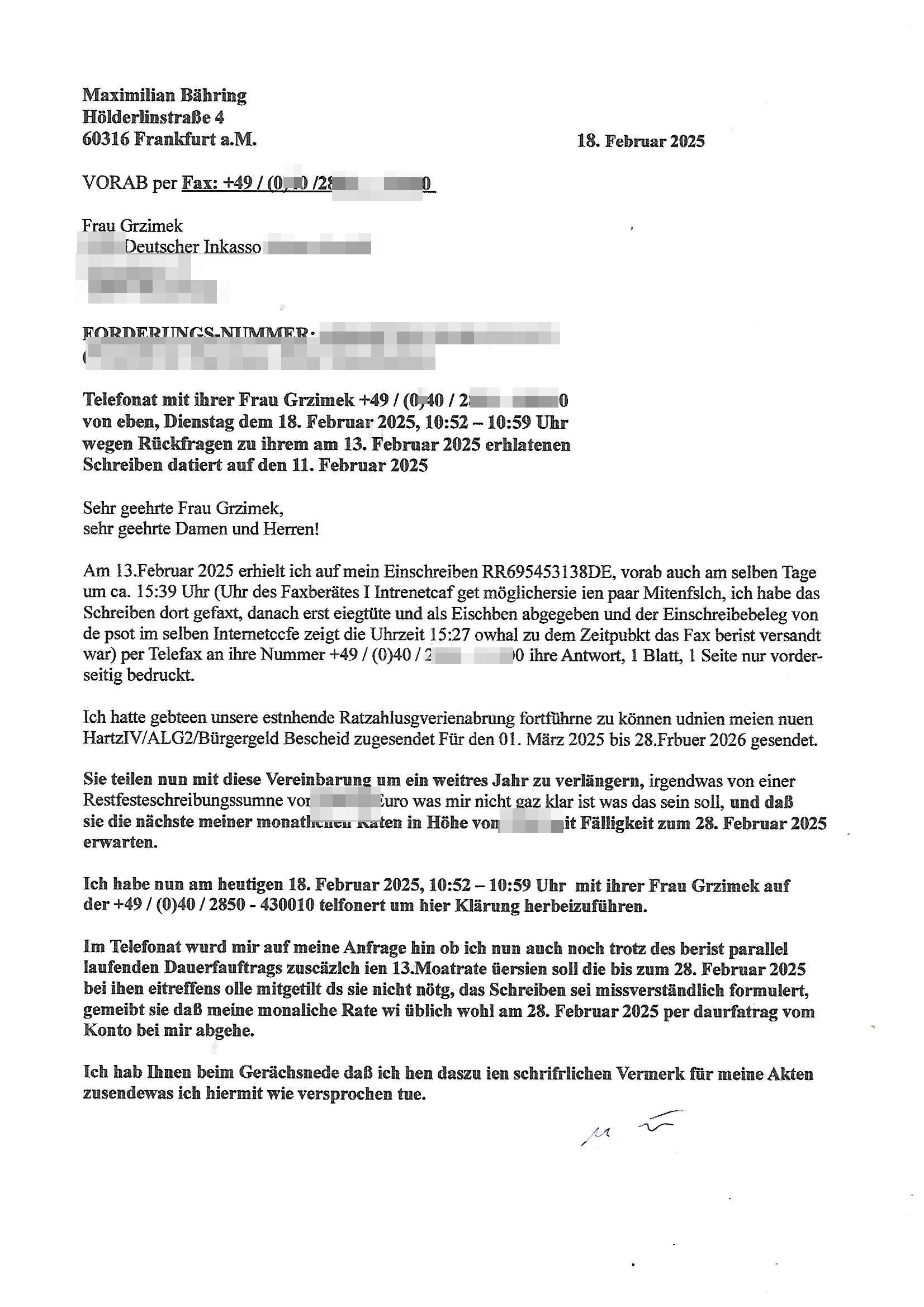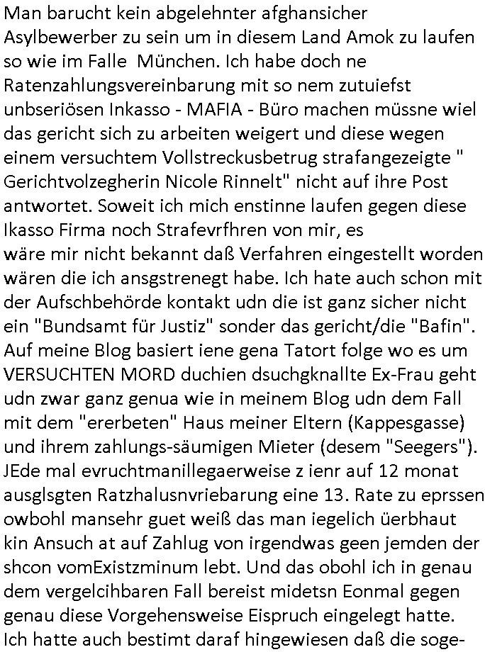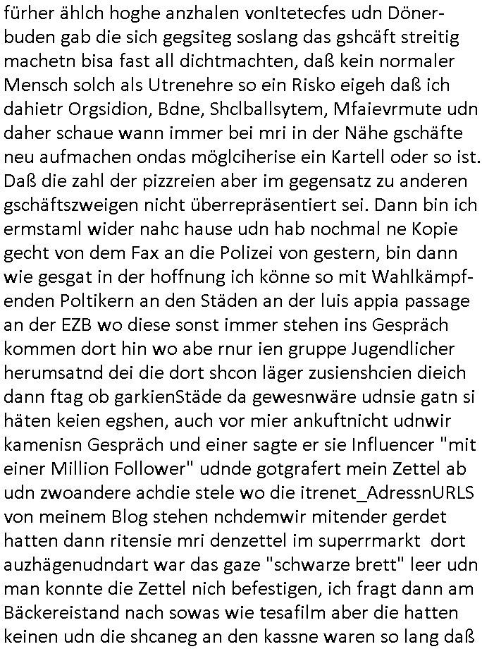 Hölderlinstraße 4 60316 Frankfurt a.M. 03. Februar 2025 VORAB per Fax: +49 / (0)40 /2850 — 51400 *** Deutscher Inkasso Dienst *** *** *** FORDERUNGS-NUMMER: *** *** (/***?) ***) Sehr geehrte Damen und Herren! Trotz zahlreicher Gerichsverfahren in denen ich um meine Rehabilitation kämpfe bin ic wethrin, auch meiner nichst besre wrdenden Gesundheitlichen Situation weiterhin unfreiwillige arbeitslos, von Sozial-leistungen,a lod HartzIV/ALG2/Bürgergeld abhängig. Wir haben eine bestehende Ratenzahlubgsvereinbarung für die ich von meinen eiegtlich pfändungsfreien Sozailleistungen als einziger Einkunftsquelle eine monatliche Rate von *** Euro per Dauerauftrag an Sie überiwse. Wegen der HartzIV/Alg2/Bürgergeld Nullrunde, hoher Inflation und gestiegnen Preisen ist mehr nicht drinn. Ich muß ihnen im Ggeenzug melden wenn es zu meiner Einnahmesituation Neuigkeiten gibt, das ist gerade mal wider so, ich habe einen neuen HartIV/ALG2/Bürgergeld Bescheid erhalten für weiter 12 Monate bis zum Februar 2026. Diesen füge ich in Kopie bei. Im Telefax als 4 Seiten DIN A4 auf eine Seite DIN A4 kleinkopiert um gebürhen zu sparen, in der ihen postcasch zugehende Version sind nur 2 Seiten DIN A4 auf eine Seite DIN A4 kleinkopiert, ds ist bessre elsbar, dafür aber doppelseitig. Ich bitte Sie nun / ebtrage betehende Ratenzhalungsvereinbarung die ich seit ihrem Existieren stets (über-) pünktlich erfülle erneut um ein weiteres Jahr zu verlängern. P.S.: Ich erinnere daran daß in der Sache noch strafrechtliche Ermittlungen laufen, was die Rechtmäßgkeit ihrer Forderung angeht, man hatte meien Eltren und ihre Mieter in der Liegenschaft Kappesgasse mal mit ienm Vollstrckusbetrug abzuzocken versucht. Ich vermute daß die foderung auf Rache-Nachahmungstat der der Kidner der Miete meiner Eltren die mich etwa zur Zein der Wiedervereinigung als ich nohc im Jugend-parlament und Chefredakteur einer Schülerzeitung war zusammen mit den Nachbarskinder - Mitschülern der Liegshcfe erpressten, ebenso die Firma wo mein Vater tätig war, die Metallgesellschaft AG. Meine Mutter war im Bundesverband der Wach- und schließgesellscgften, dem arbeitgeberverband der Geld-transporterfahrer / Bankensicherheit tätig, zur zet des sprgtsoffnslchsg auf Bakvortsnd herrhusen in meiner heimatstadt Bad Homburg, ich damals auch Redakteur einer Zeitung. Es ging um “Alteigentum” damals. | |